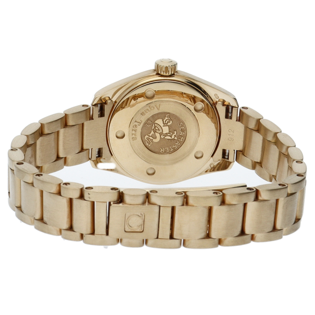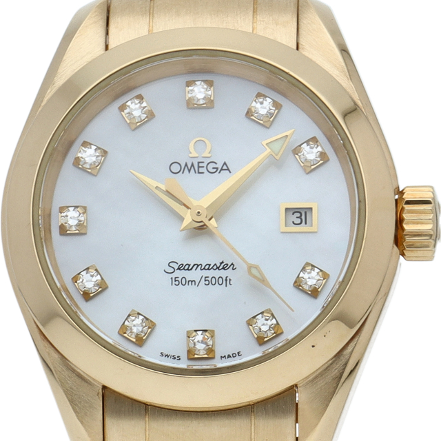 オメガの「シーマスターアクアテラ」です。スポーツモデルでありながら、18Kイエローゴールドを使用した、高級感のあるモデルです。文字盤にはホワイトシェルを使用、インデックスには11Pダイヤをあしらったモデルです。150M防水ですので機能面でも優れています。