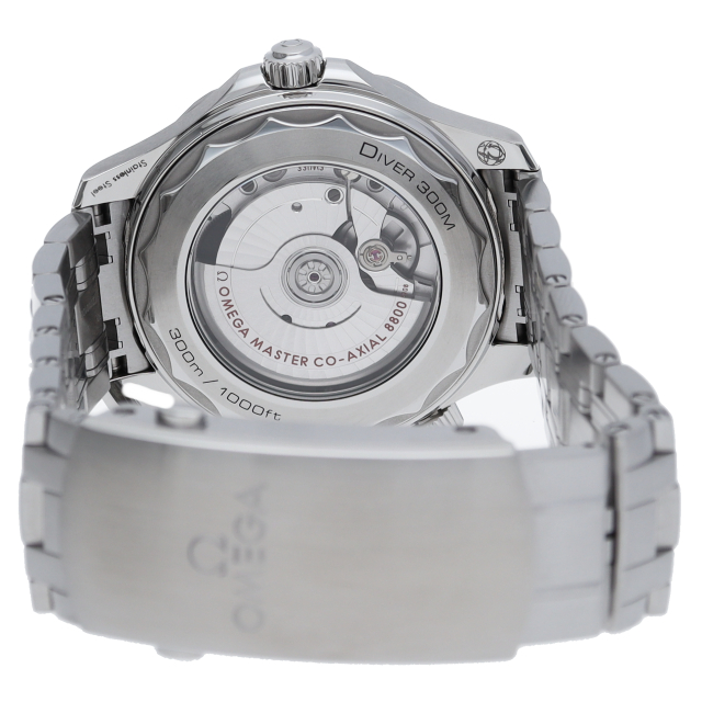 オメガの定番ダイバーズウォッチです。2018年に発表された最新型です。オメガ最新式の機械であるキャリバー8800を搭載しマスタークロノメーター化されました。シースルーバックとなり、中の機械を見て楽しむ事ができます。