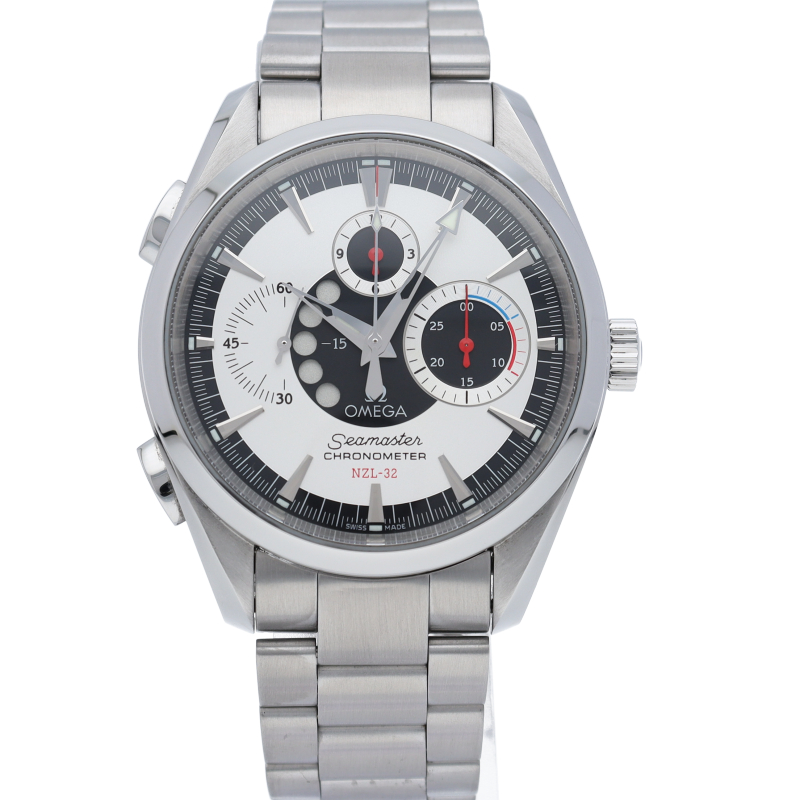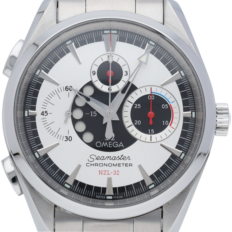 オメガを代表する人気ダイバーズウォッチで、カウントダウンヨットタイマーを搭載したシーマスターアクアテラクロノNZL-32です。1995年のアメリカズ・カップ優勝艇であるNZL-32の名を冠した限定モデルです。