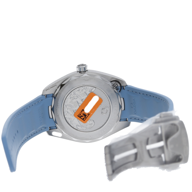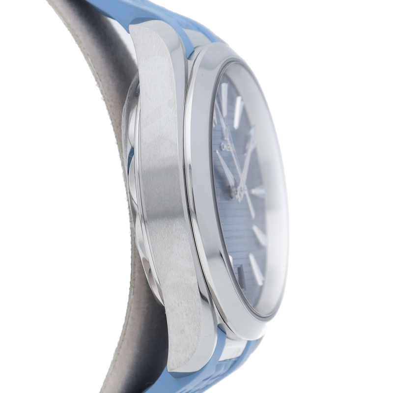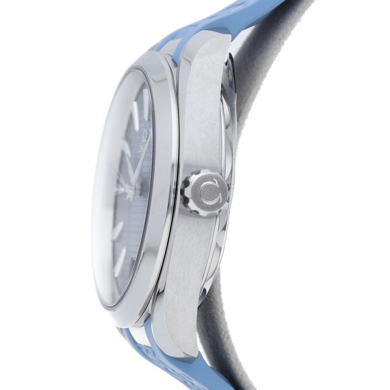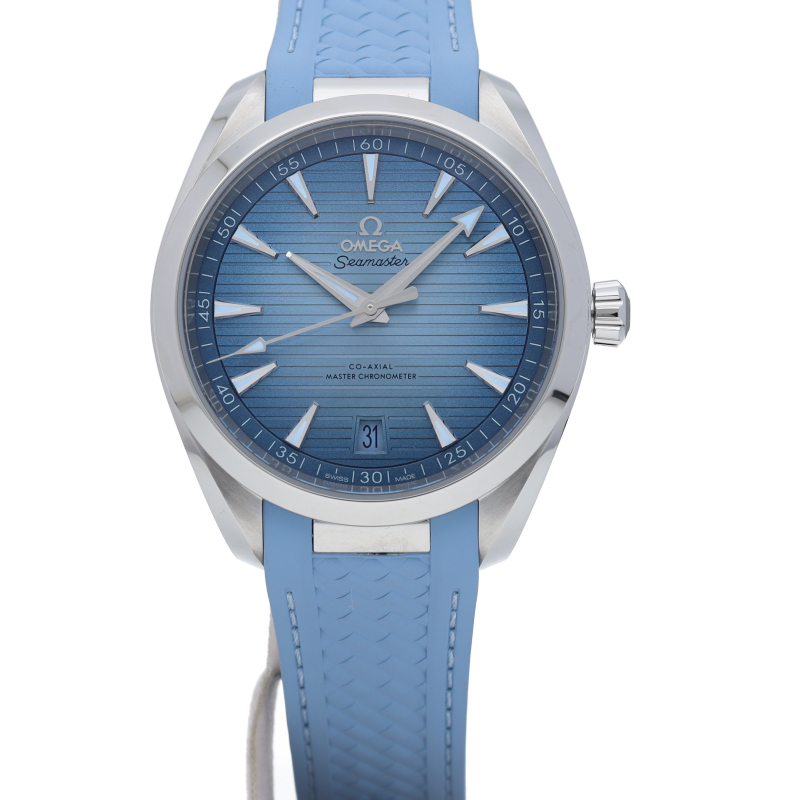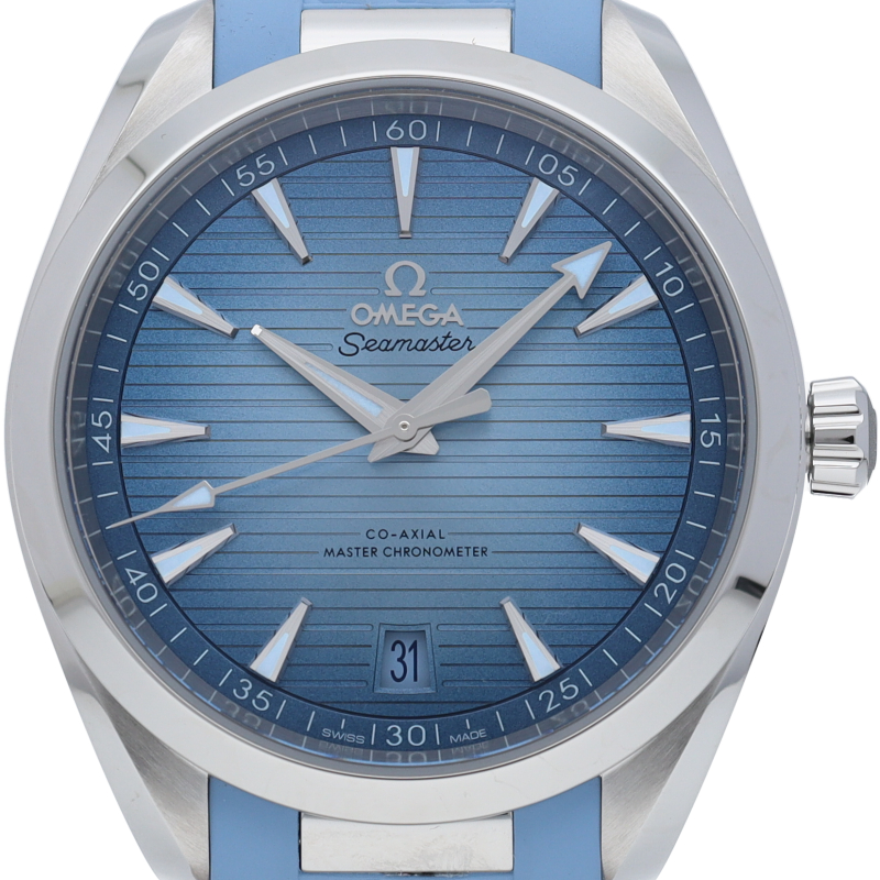 海に携わってきたオメガの長い歴史を代表する「シーマスター アクアテラ」 コレクション。ブルーのダイアルは、豪華ヨットのウッドデッキをイメージさせる印象的なデザイン「チークコンセプト」と呼ばれる横ストライプのモチーフが採用されています。ロジウムプレート加工が施された針とインデックスにはホワイトのスーパールミノヴァが塗布され、6時位置には日付表示が備えられています。キャリバー8900搭載。