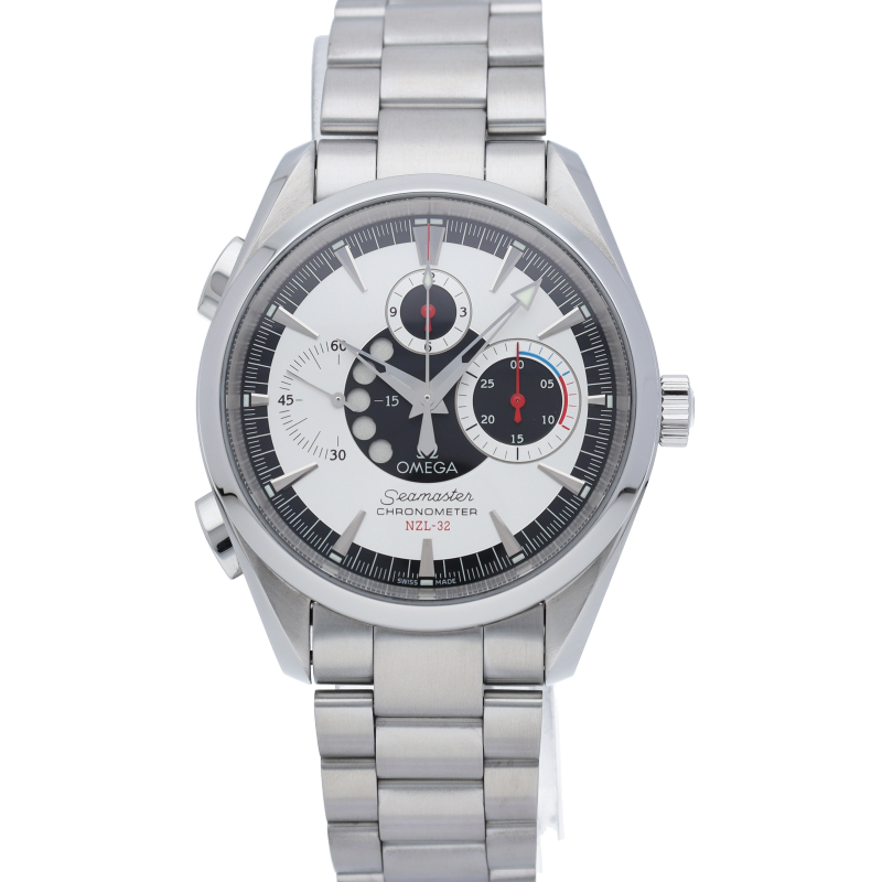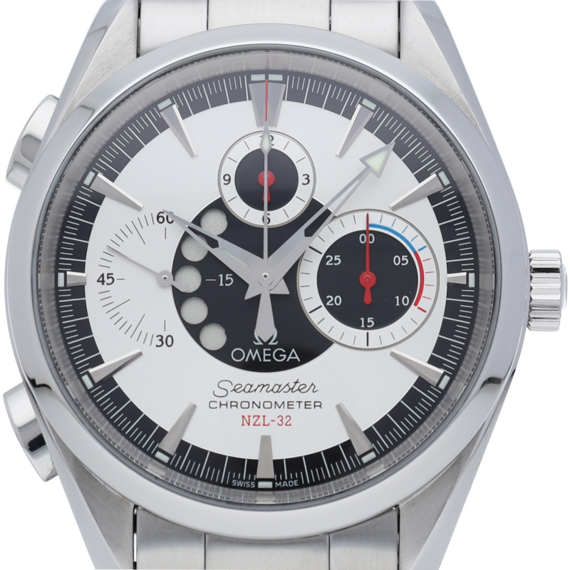 オメガを代表する人気ダイバーズウォッチで、カウントダウンヨットタイマーを搭載したシーマスターアクアテラクロノNZL-32です。1995年のアメリカズ・カップ優勝艇であるNZL-32の名を冠した限定モデルです。