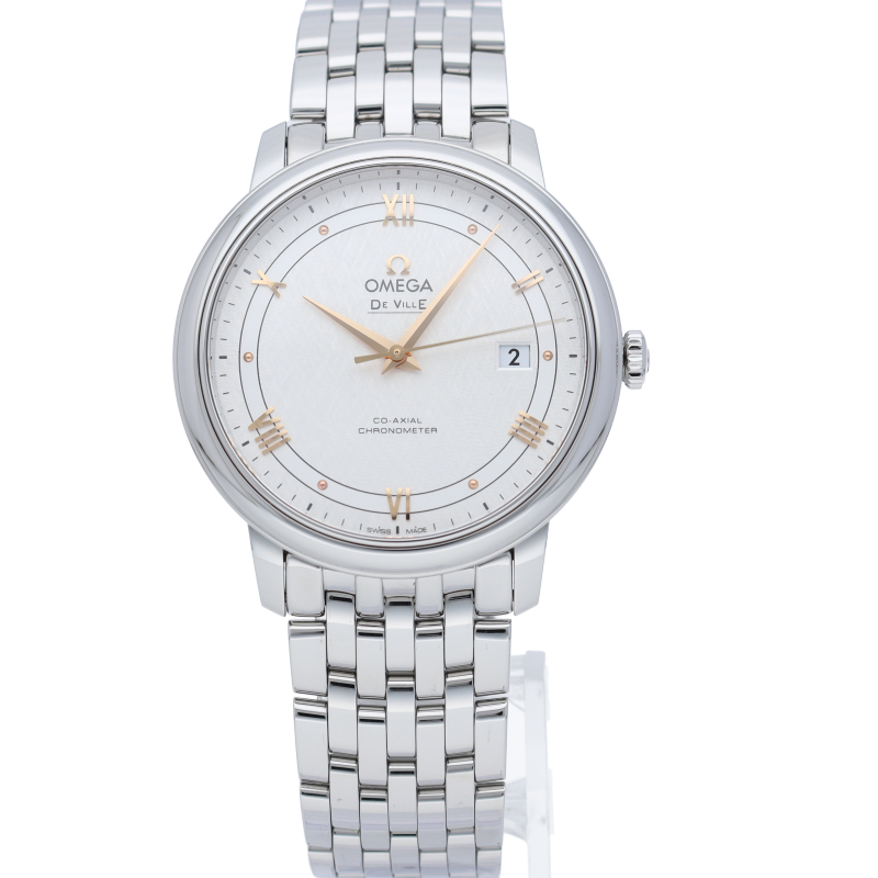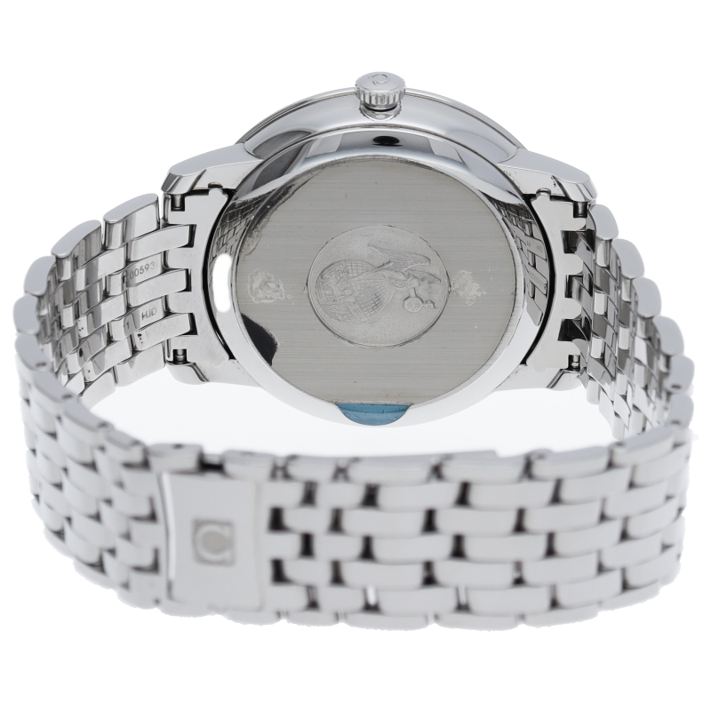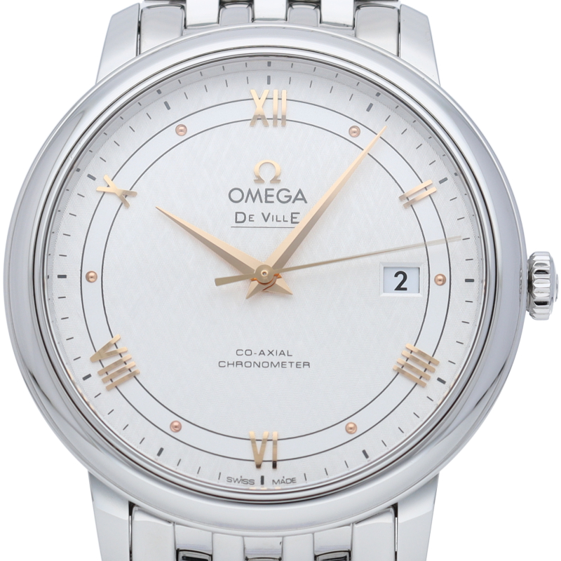 フランス語で「都会の」という意味をネーミングとしたコレクションが「デ・ヴィル」です。高精度と高耐久性を誇るコーアクシャル・エスケープメントを搭載したオメガのラグジュアリーモデルです。プレステージはデ・ヴィルのスタンダード仕様。日付表示のみというシンプルな構成となります。オメガ自社製自動巻きムーブメント・オメガ2500を搭載しています。