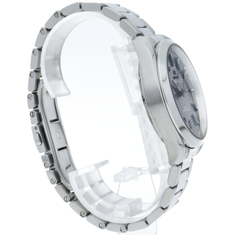 海に携わってきたオメガの長い歴史を代表する「シーマスター アクアテラ」 コレクション。シンメトリックな41mmのケースはステンレススティール製で、ケースバックにはウェーブ模様で縁取られたデザインが施されています。