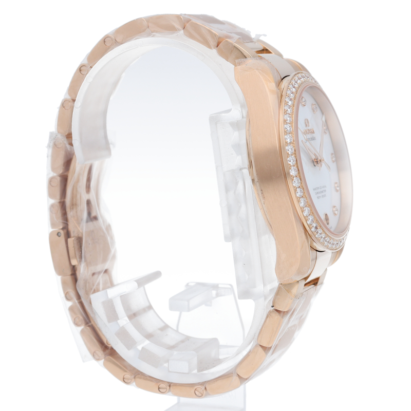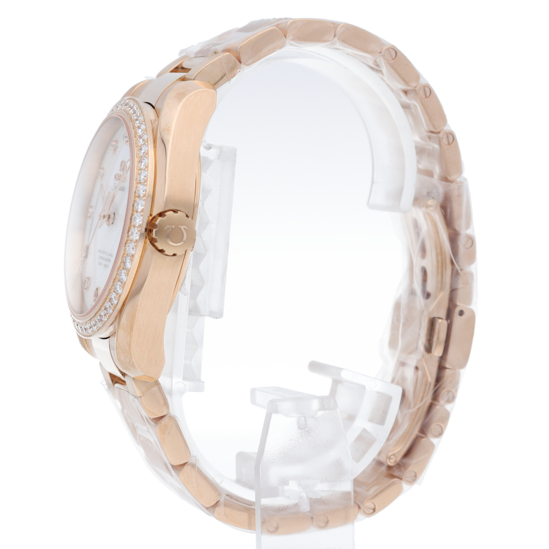 どんなシーンにも使える上品でシンプルなデザインが特徴の「アクアテラ」。視認性に優れたアロー針が使用されファッショナブルでスポーティーな1本。ピンクゴールドとベゼルダイヤのコントラストが高級感を漂わせます。