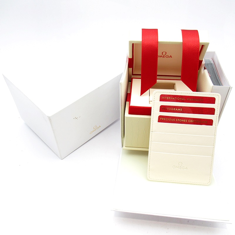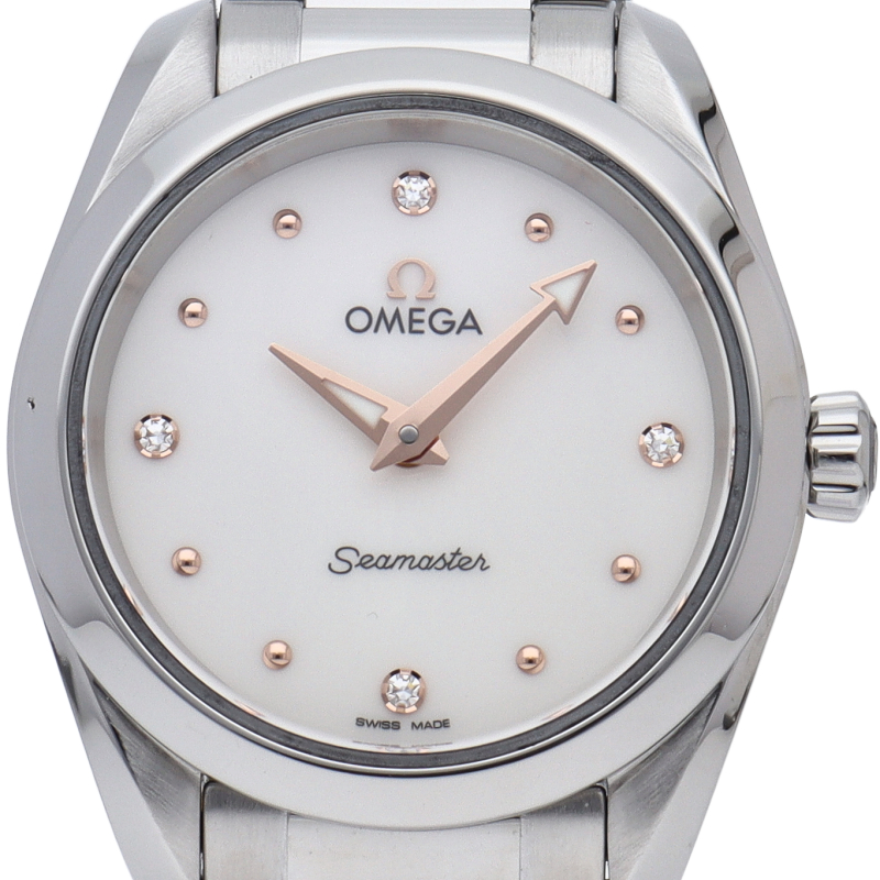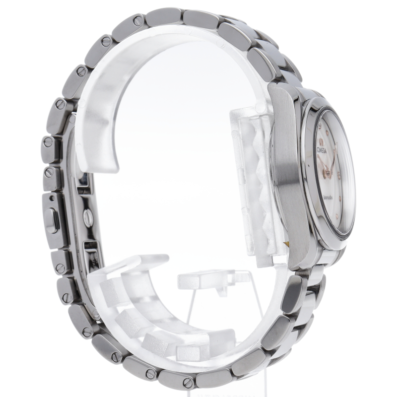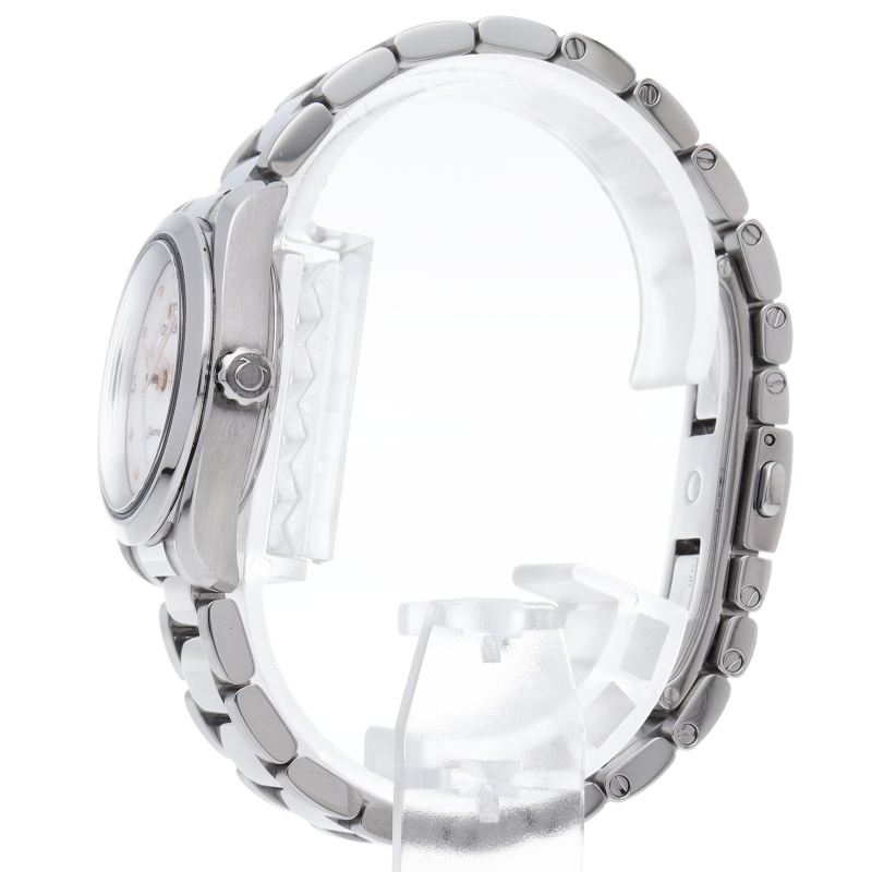 シンメトリックなステンレススティール製の28mmケースには、シマーホワイトのダイアルに、8個の18Kセドナゴールド製ドットインデックスと 、18Kセドナゴールドのホルダーに4個のダイヤモンドをセットしたインデックスが配されています。針は18Kセドナゴールド製で、ケースバックには、波模様の背景にオメガのシーホースのエンブレムが刻まれています。