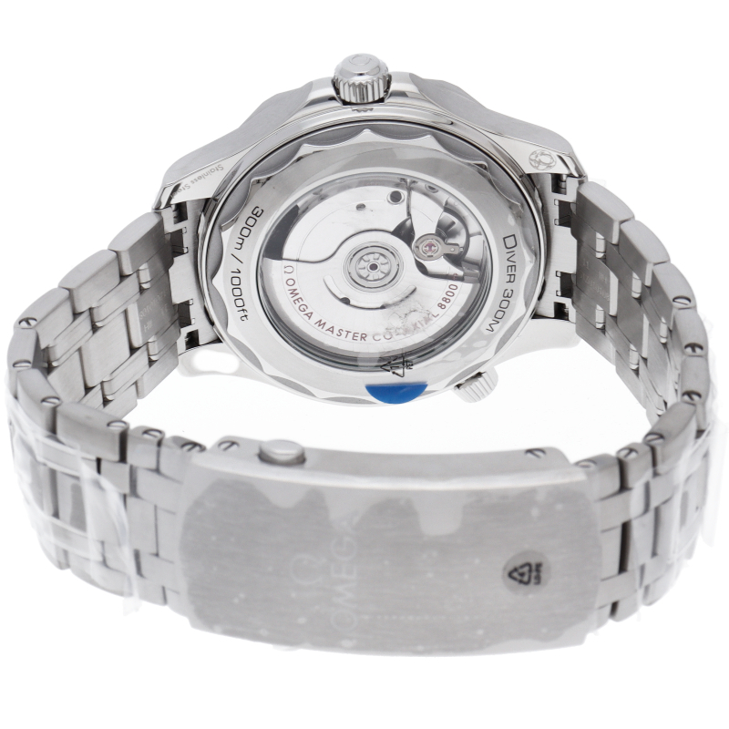 オメガの定番ダイバーズウォッチです。2018年に発表された最新型です。オメガ最新式の機械であるキャリバー8800を搭載しマスタークロノメーター化されました。シースルーバックとなり、中の機械を見て楽しむ事ができます。