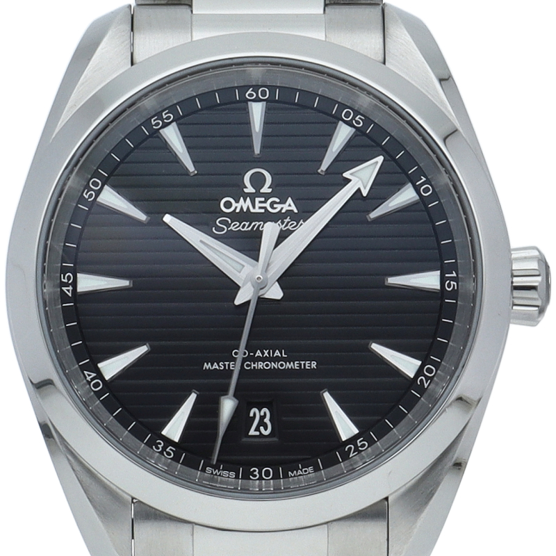 海に携わってきたオメガの長い歴史を代表する「シーマスター アクアテラ」 コレクション。シンメトリックな38mmのケースはステンレススティール製で、ケースバックにはウェーブ模様で縁取られたデザインが施されています。