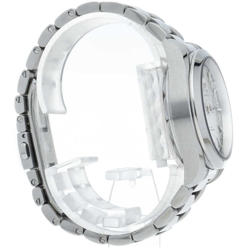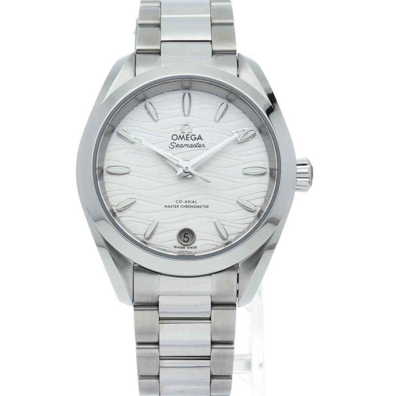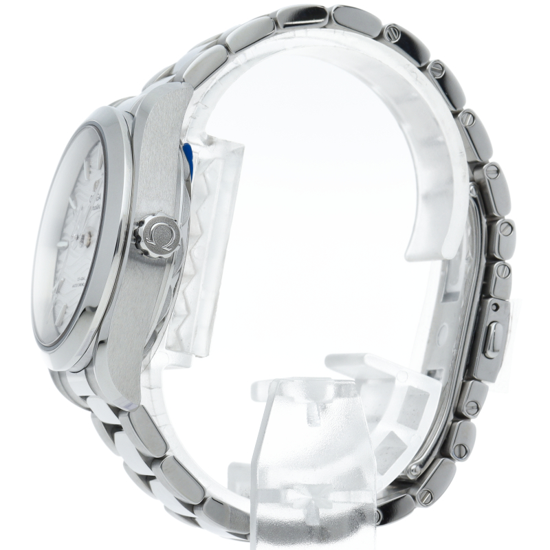 「シーマスター アクアテラ コーアクシャル マスター クロノメーター」のレディースモデル。繊細かつ立体的な波模様が施されたシルバーダイアルの上を、ヨットの船体を模したインデックスが漂うデザインは、スポーティーながらも、女性らしい上品さと高級感を演出します。スイス連邦計量・認定局(METAS)の最高水準を誇る超高耐磁性能ムーブメント「Cal.8800」搭載。