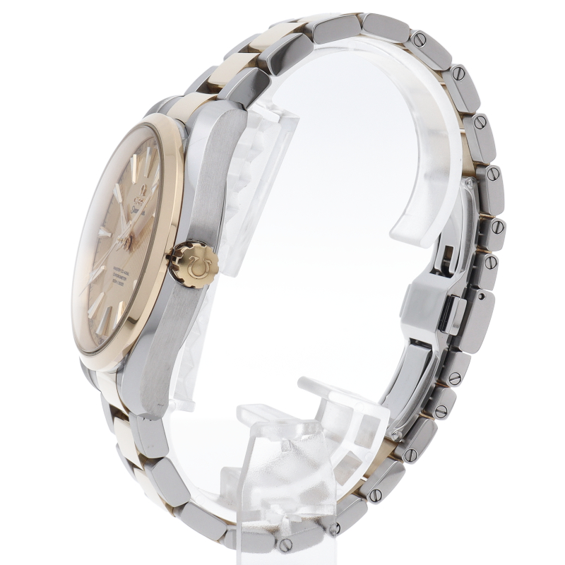 「シーマスター アクアテラ」。このモデルは、サンブラッシュ仕上げとラッカー仕上げのシャンパン色のダイアルに、「チークコンセプト」と呼ばれる縦縞模様の装飾と、3時位置の日付窓が特徴です。ダイアルは傷の付きにくいサファイア・クリスタル ガラスによって保護されています