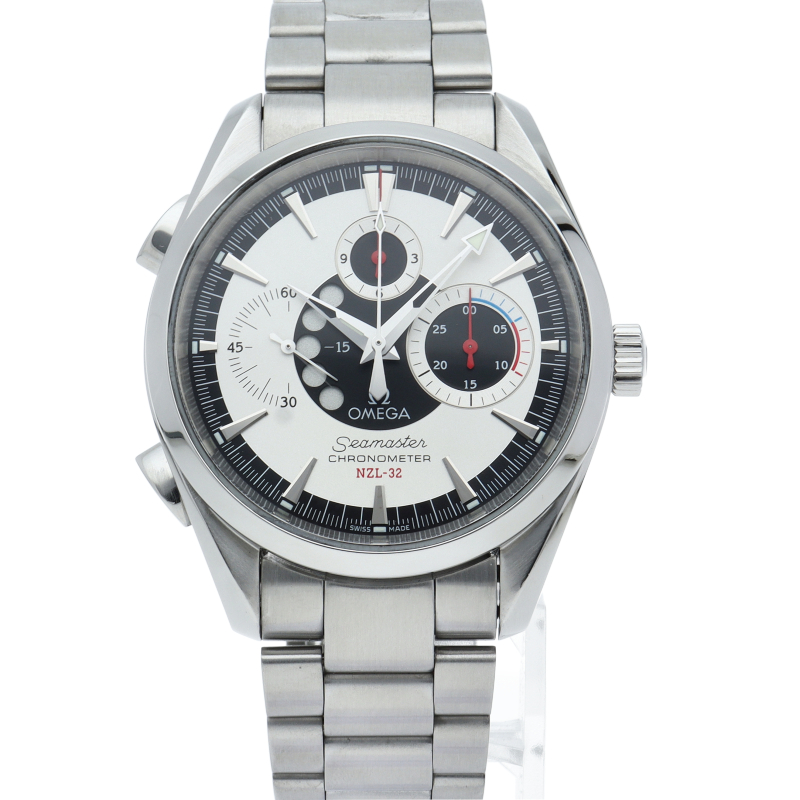 オメガを代表する人気ダイバーズウォッチで、カウントダウンヨットタイマーを搭載したシーマスターアクアテラクロノNZL-32です。1995年のアメリカズ・カップ優勝艇であるNZL-32の名を冠した限定モデルです。
