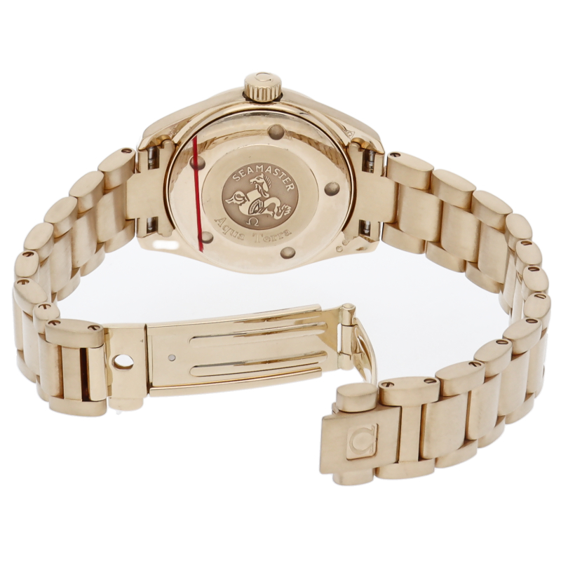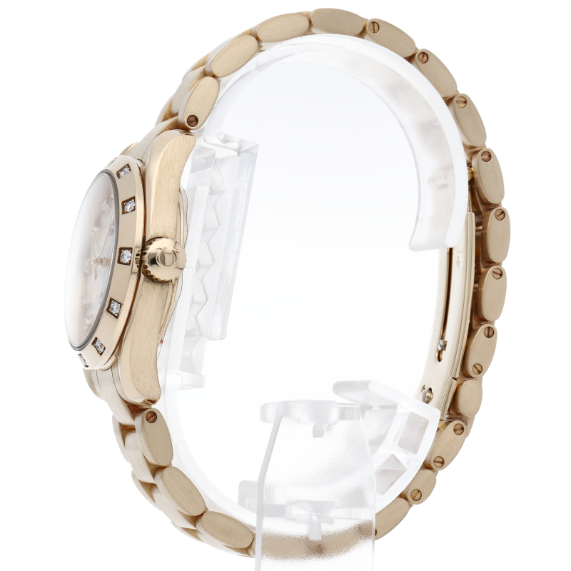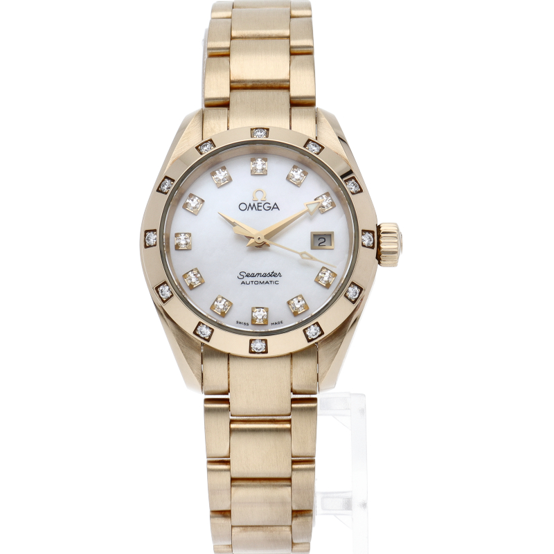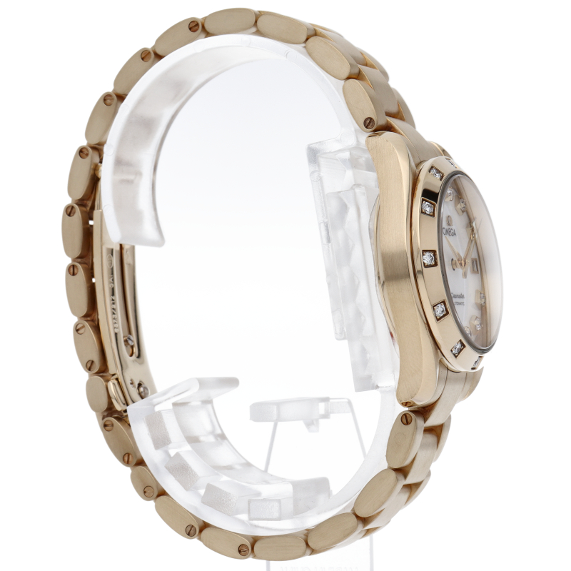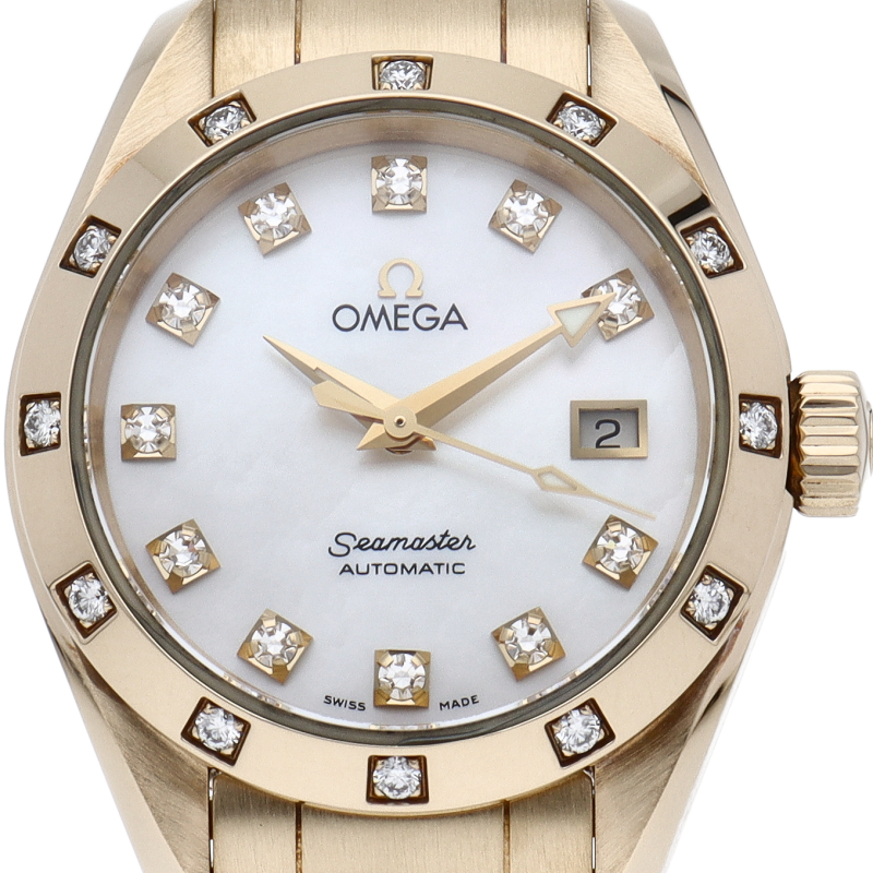 スタイリッシュな『シーマスター アクアテラ』。こちらはイエローゴールド製のレディースモデルです。ベゼルやインデックスにはダイヤモンドがセッティングされ、華やかな雰囲気を演出。スポーティーながらエレガンスも感じさせる一本になっています。