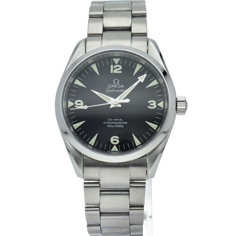 シーマスターアクアテラの派生モデルとして復活を果たしたレイルマスター。ネーミング通り鉄道時計モデルらしく視認性を最大限に強調したダイアルが特徴的といえます。150m防水、ねじ込み式リューズなど基本スペックはアクアテラと同様となります。