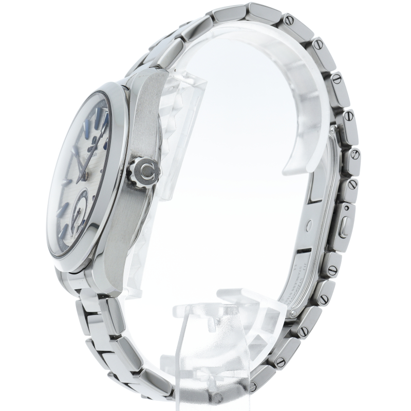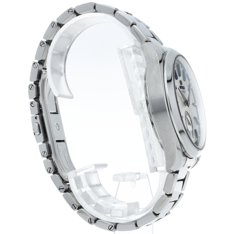 ブラッシュ仕上げのシルバーブルーの文字盤には横縞模様の“チーク”パターンが施され、6時位置に日付表示窓とロジウム仕上げのリングが付いたスモールセコンド サブダイアルが配されています。ホワイトのスーパールミノヴァが塗布されたブルーの針とインデックス、文字盤とサブダイアルのサンドブラスト加工のミニッツトラックとセコンドトラックがデザインを引き立てます。