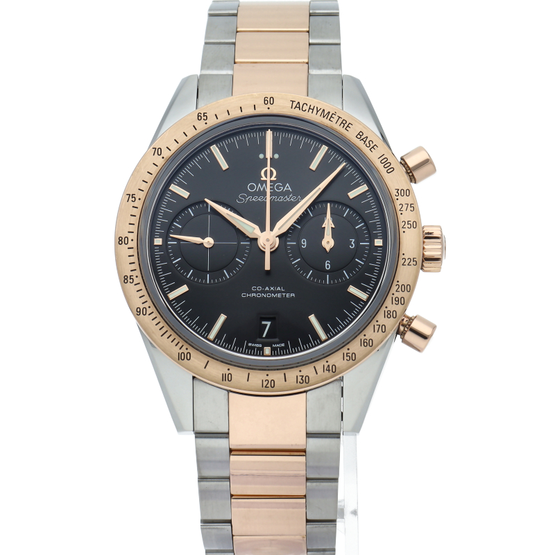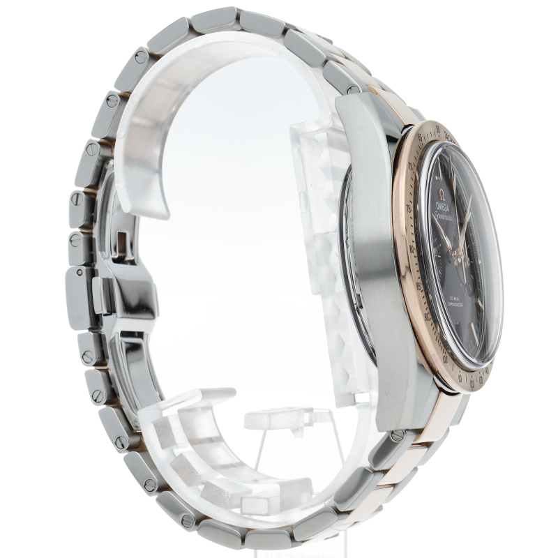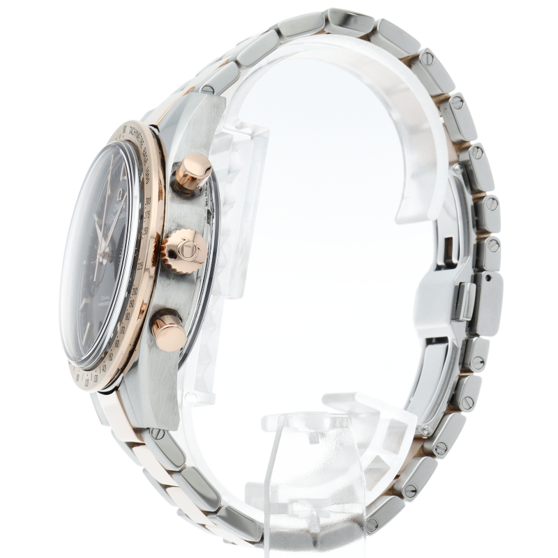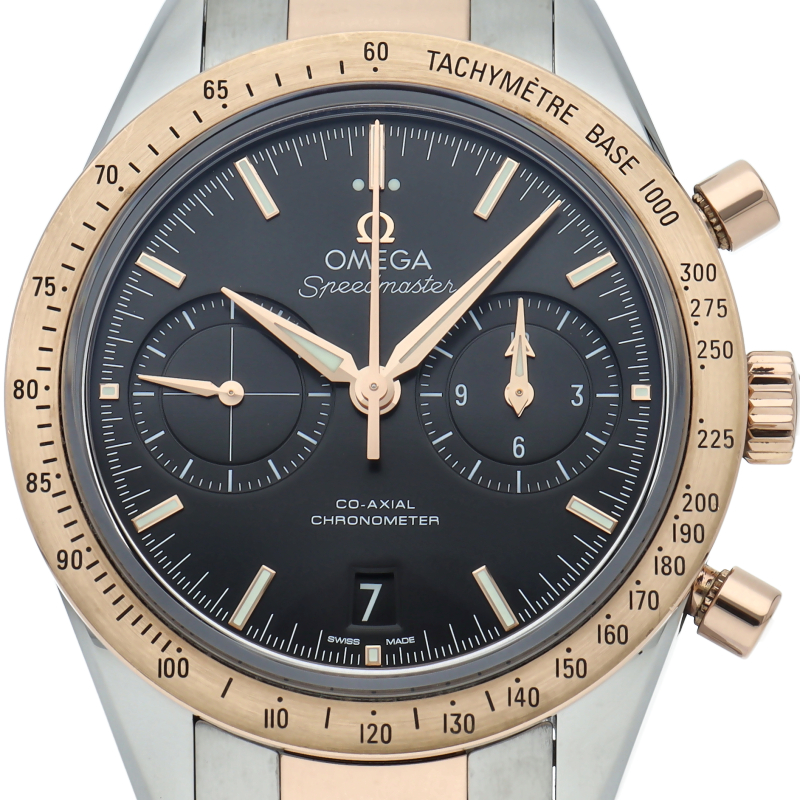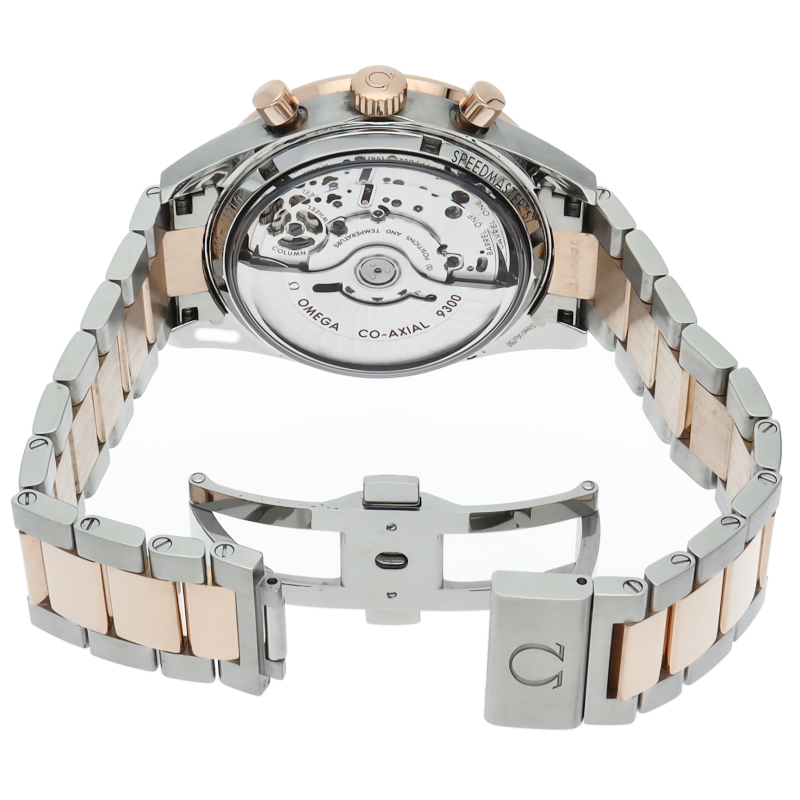 こちらは1957年に発表されたスピードマスターの1stモデルを最新技術で復活させた18Kレッドゴールドとステンレススティールのコンビが現代的で華やかなモデルです。すっきりとした2カウンタークロノグラフにアルファ・ハンド針、リューズガードを持たないこの顔付きはクラシカルな印象を持ちます。ムーブメントにはオメガ独自の「コーアクシャル・キャリバー9300」を搭載。