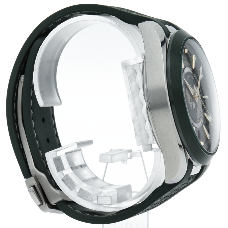 全体をグリーン色で美しく落ち着いた雰囲気でまとめ、ムーンシャインゴールドを採用することによりゴージャスな印象の「220.32.43.22.10.001」。世界24都市の時間帯を同一文字盤上で瞬時に確認可能なワールドタイマー機能を備えます。文字盤中央のチタン製プレートには、レーザー加工で立体的に地球のエングレービングが施されています。