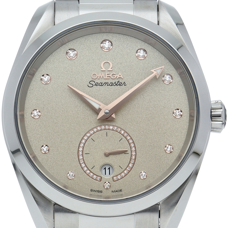 歴史有るペットネーム「シーマスター」を継承する、「シーマスター コーアクシャル アクアテラ マスタークロノメーター」。文字盤には美しいグレーカラーのダイアルを採用、6時位置に日付表示窓と、ダイヤ付スモールセコンドサブダイアルが配されています。ムーブメントにはMETAS認定マスタークロノメーターのコーアクシャルキャリバー8802を搭載。
