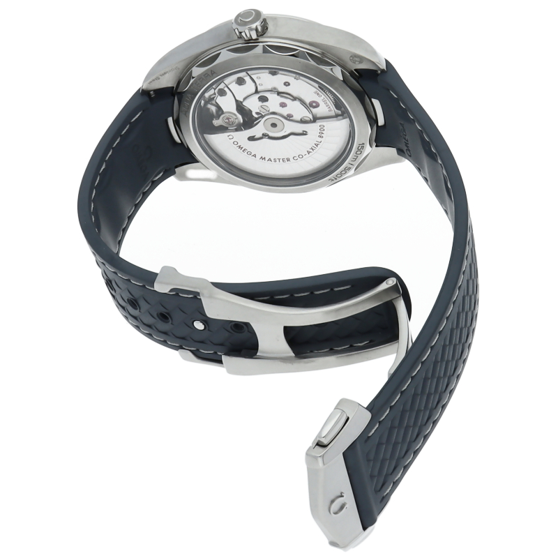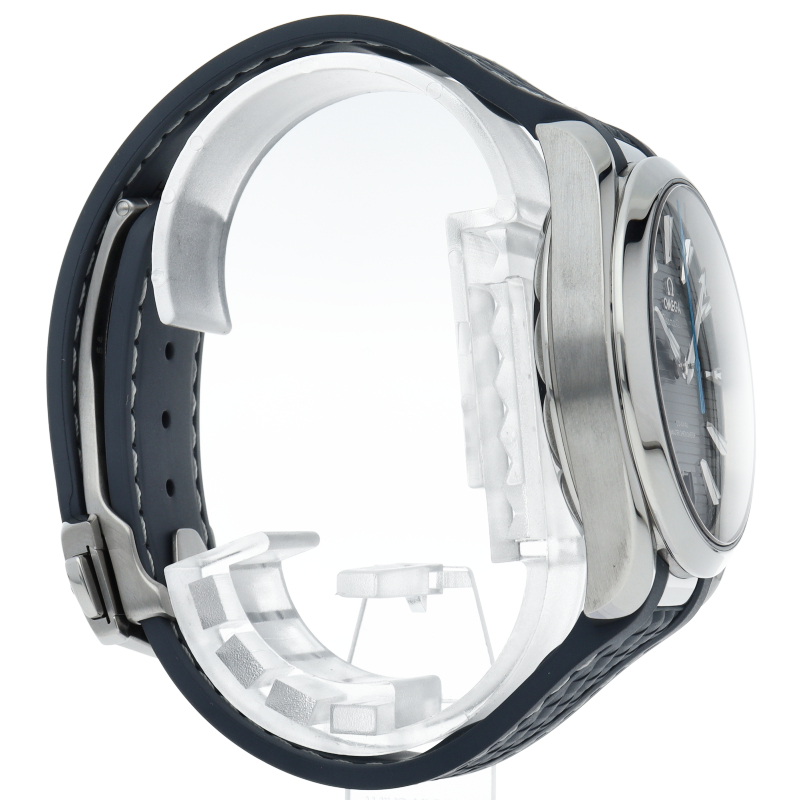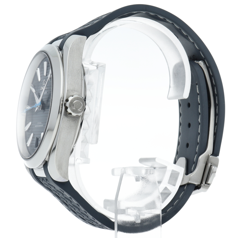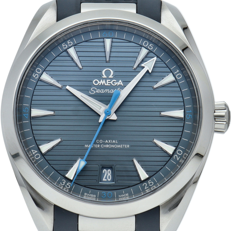 海に携わってきたオメガの長い歴史を代表する「シーマスター アクアテラ」 コレクション。ブルーのダイアルは、豪華ヨットのウッドデッキをイメージさせる印象的なデザイン「チークコンセプト」と呼ばれる横ストライプのモチーフが採用されています。ロジウムプレート加工が施された針とインデックスにはホワイトのスーパールミノヴァが塗布され、6時位置には日付表示が備えられています。キャリバー8900搭載。