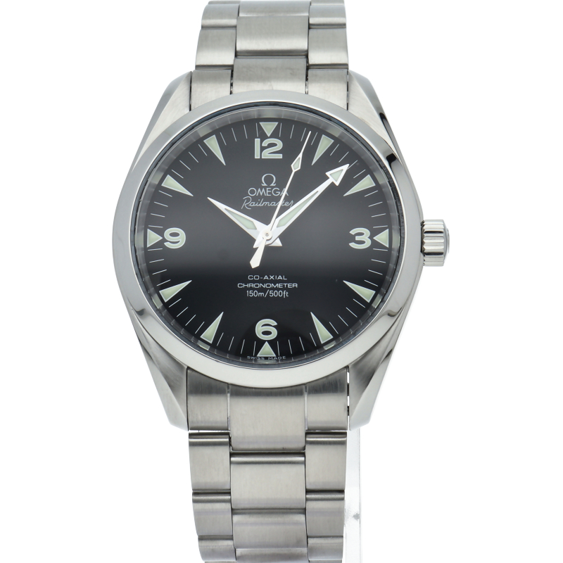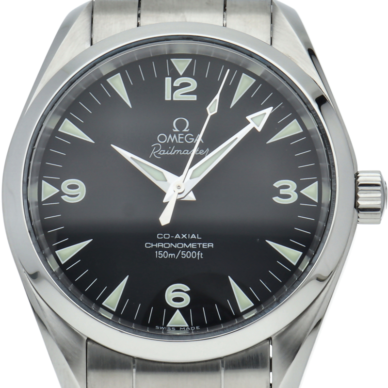 シーマスターアクアテラの派生モデルとして復活を果たしたレイルマスター。ネーミング通り鉄道時計モデルらしく視認性を最大限に強調したダイアルが特徴的といえます。150m防水、ねじ込み式リューズなど基本スペックはアクアテラと同様となります。