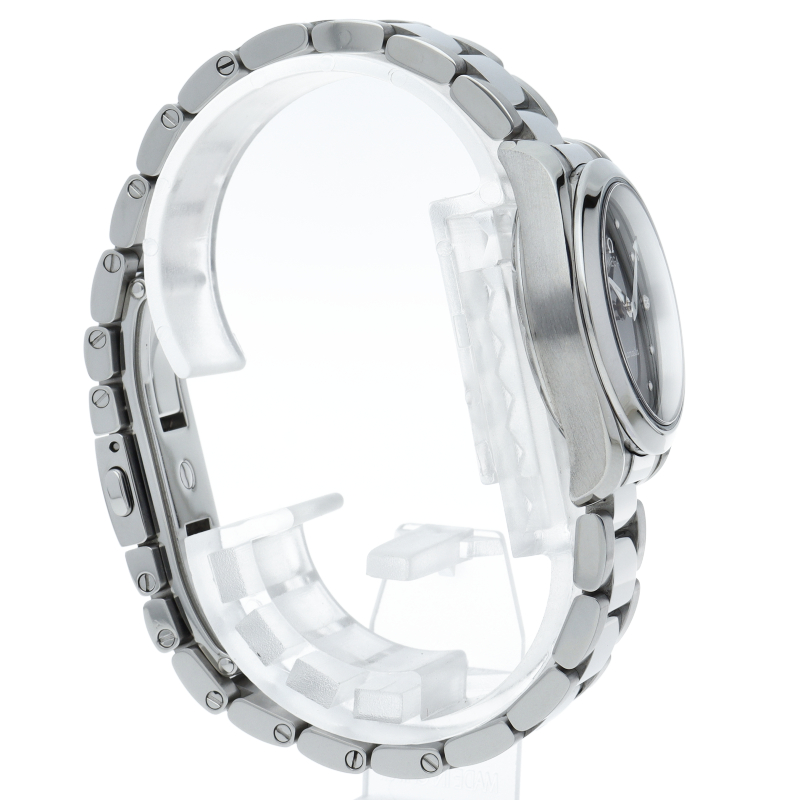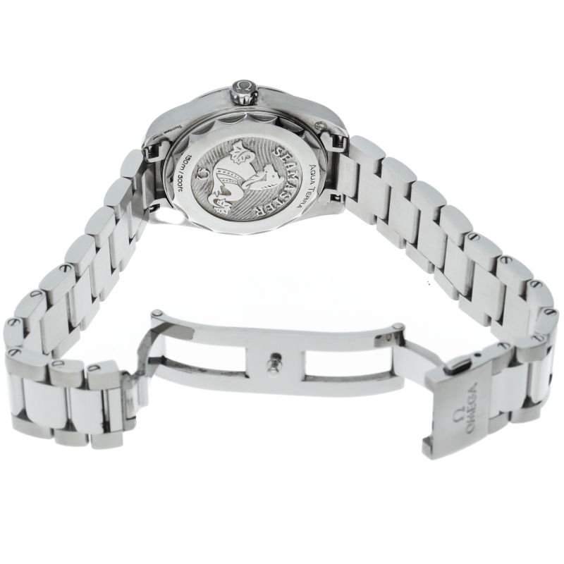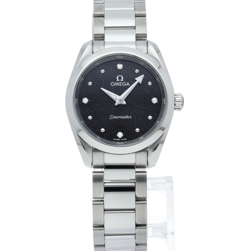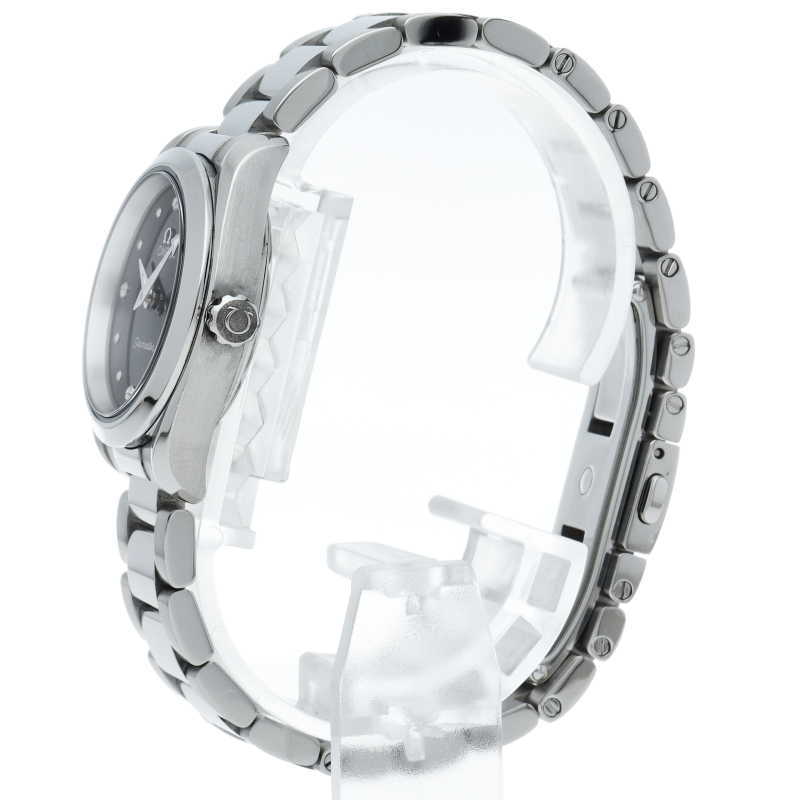シンメトリックなステンレススティール製の28mmケースには、シマーブラックのダイアルに、8個のロジウムプレートを施したドットインデックスと、ロジウムプレートのホルダーに4個のダイヤモンドをセットしたインデックスが配されています。針にもロジウムプレート加工が施され、ケースバックには、波模様の背景にオメガのシーホースのエンブレムが刻まれています。