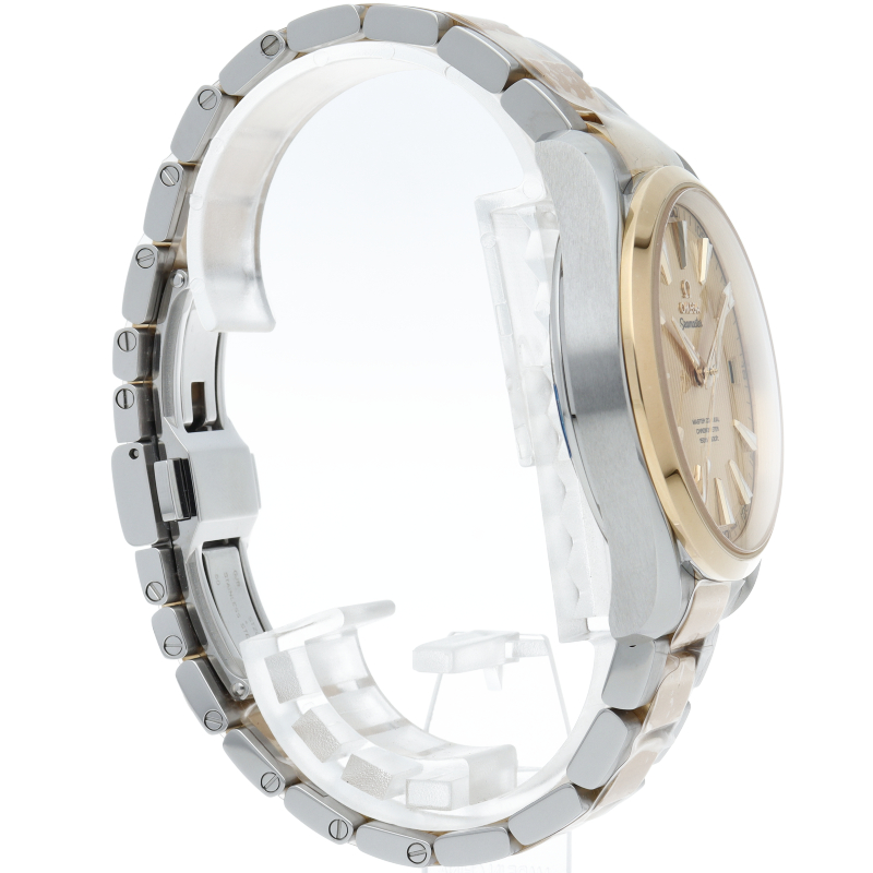 「シーマスター アクアテラ」。このモデルは、サンブラッシュ仕上げとラッカー仕上げのシャンパン色のダイアルに、「チークコンセプト」と呼ばれる縦縞模様の装飾と、3時位置の日付窓が特徴です。ダイアルは傷の付きにくいサファイア・クリスタル ガラスによって保護されています