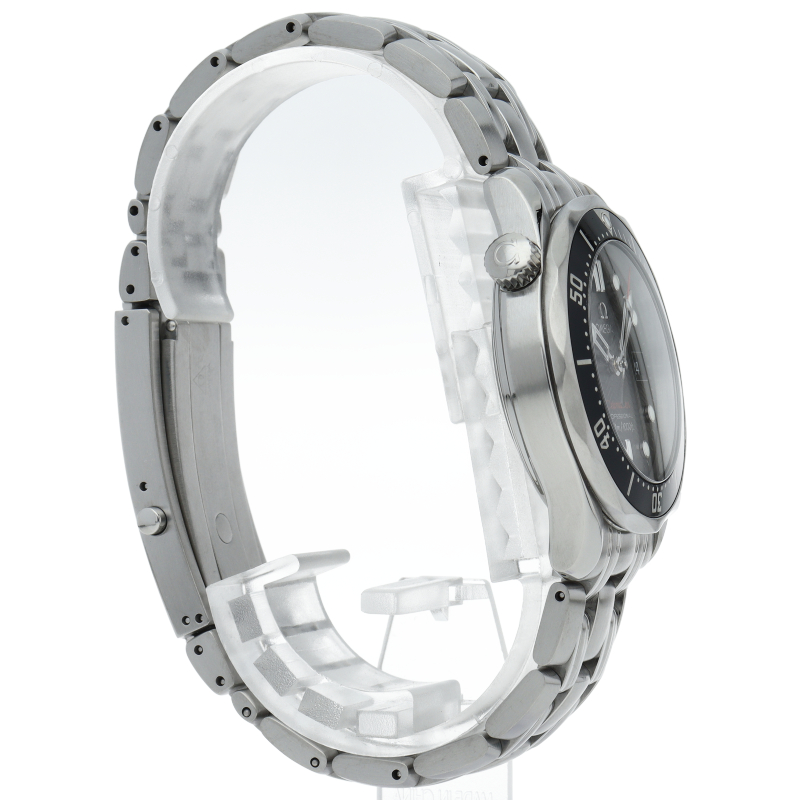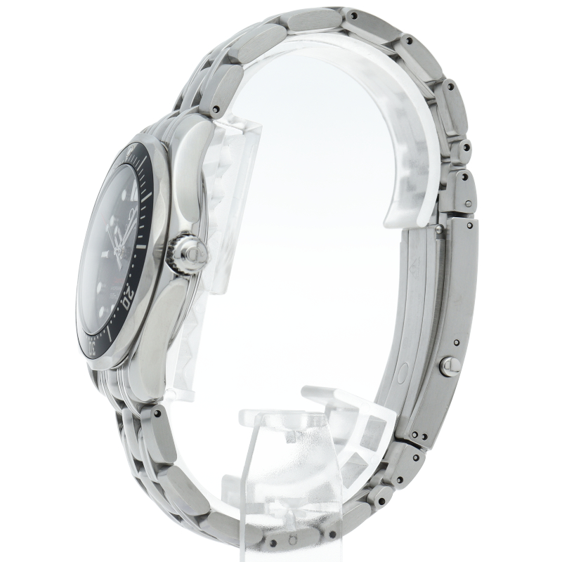 オメガを代表する人気ダイバーズウォッチ「シーマスター」。ヘリウムエスケープバルブを備えた本格的な多機能ダイバーズモデル。黒い文字盤がシャープな印象でスポーティ。ビジネスシーンから本格的なダイビングまでカバーできるオススメの一本です。