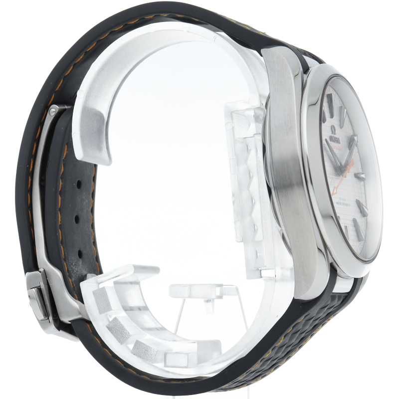 海に携わってきたオメガの長い歴史を代表する「シーマスター アクアテラ」 コレクション。シンメトリックな41mmのケースはステンレススティール製で、ケースバックにはウェーブ模様で縁取られたデザインが施されています。