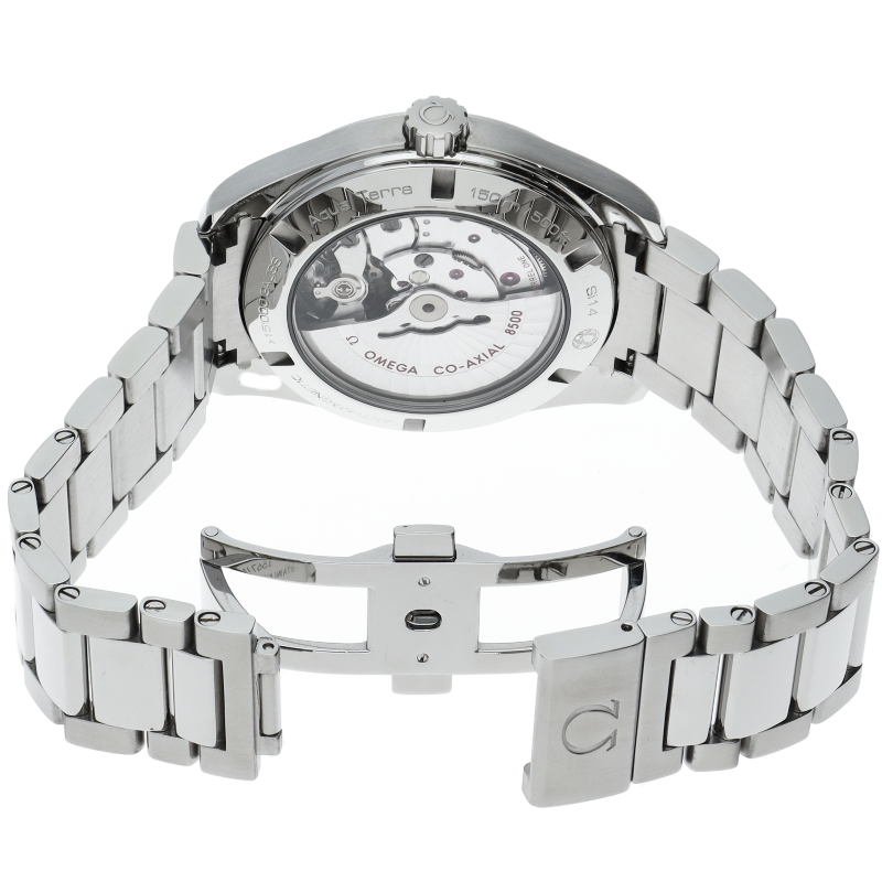 上品でどんなシーンでも使えるシンプルなデザインが特徴の「アクアテラ」。ブルーのダイアルには、中央にサンブラッシュ仕上げが施されており、波模様が転写されています。15,000ガウス以上の耐磁性能を備えたオメガ マスター コーアクシャル キャリバー8500搭載は、ケースバックから眺めることができます。