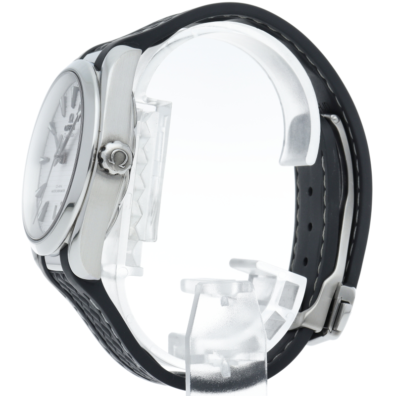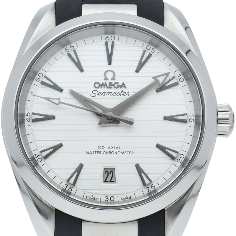 海に携わってきたオメガの長い歴史を代表する「シーマスター アクアテラ」 コレクション。シルバーのダイアルは、豪華ヨットのウッドデッキをイメージさせる印象的なデザイン「チークコンセプト」と呼ばれる横ストライプのモチーフが採用されています。ブラックの針とインデックスにはホワイトのスーパールミノヴァが塗布され、6時位置には日付表示が備えられています。