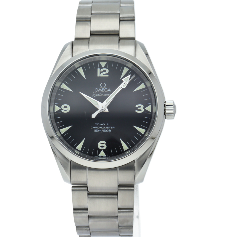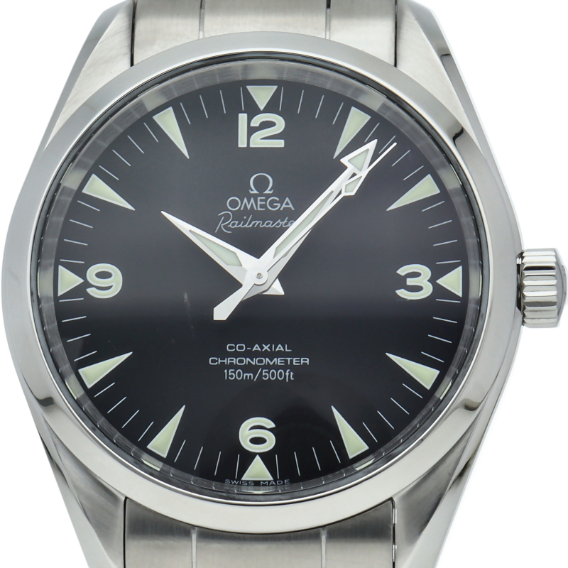 シーマスターアクアテラの派生モデルとして復活を果たしたレイルマスター。ネーミング通り鉄道時計モデルらしく視認性を最大限に強調したダイアルが特徴的といえます。150m防水、ねじ込み式リューズなど基本スペックはアクアテラと同様となります。