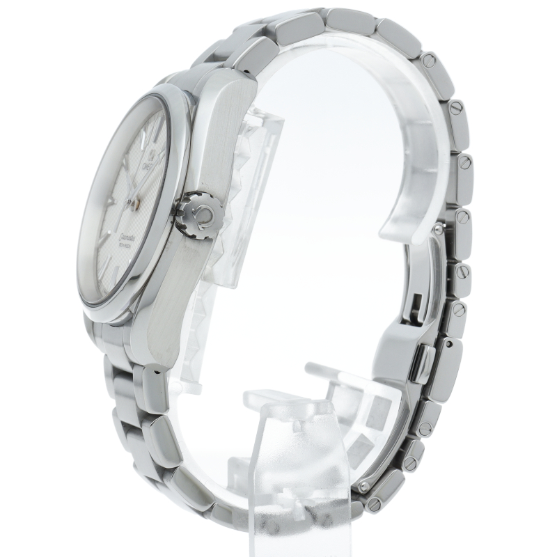上品でどんなシーンでも使えるシンプルなデザインが特徴の「アクアテラ」。視認性に優れたアロー針が使用されファッショナブルでスポーティーな1本。仕様が変更されたストライプ模様の文字盤です。