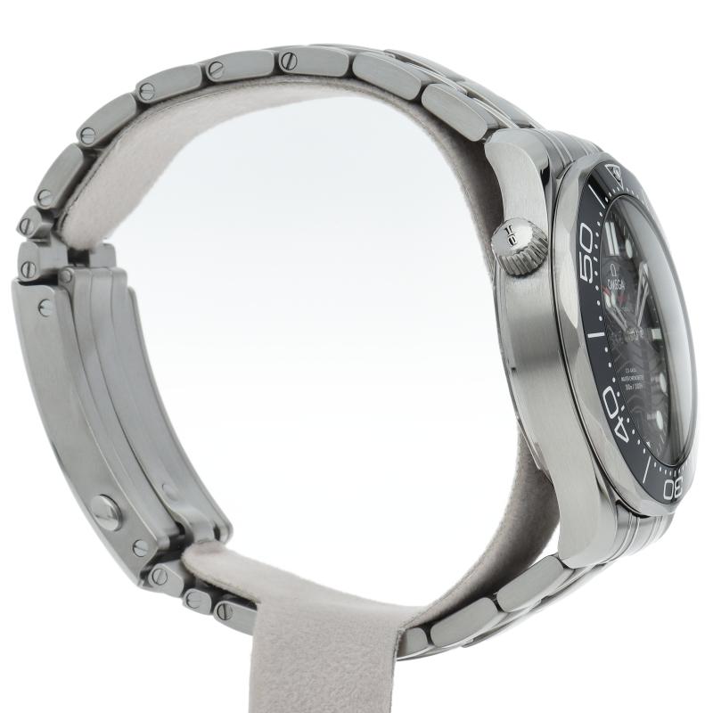オメガの定番ダイバーズウォッチです。2018年に発表された最新型です。オメガ最新式の機械であるキャリバー8800を搭載しマスタークロノメーター化されました。シースルーバックとなり、中の機械を見て楽しむ事ができます。