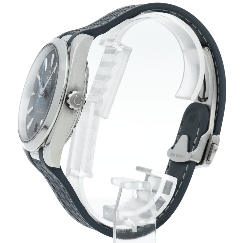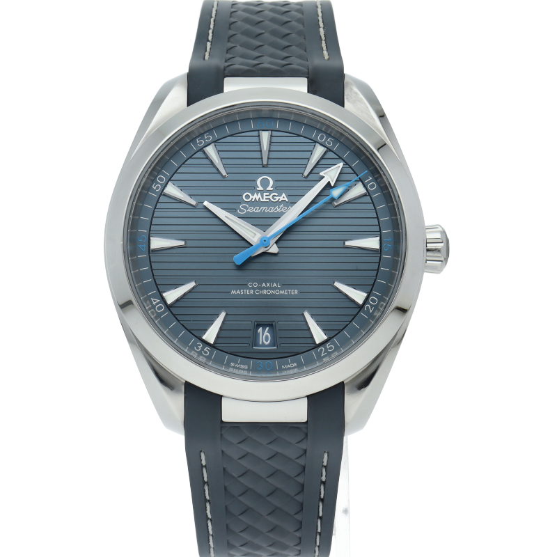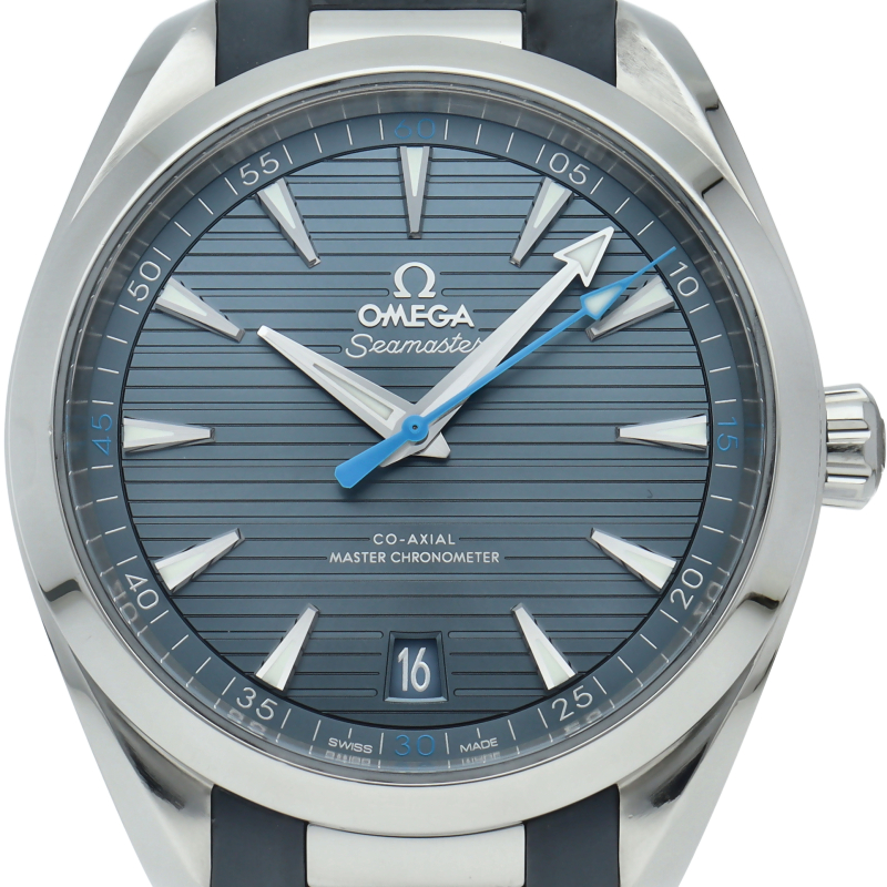 海に携わってきたオメガの長い歴史を代表する「シーマスター アクアテラ」 コレクション。ブルーのダイアルは、豪華ヨットのウッドデッキをイメージさせる印象的なデザイン「チークコンセプト」と呼ばれる横ストライプのモチーフが採用されています。ロジウムプレート加工が施された針とインデックスにはホワイトのスーパールミノヴァが塗布され、6時位置には日付表示が備えられています。キャリバー8900搭載。