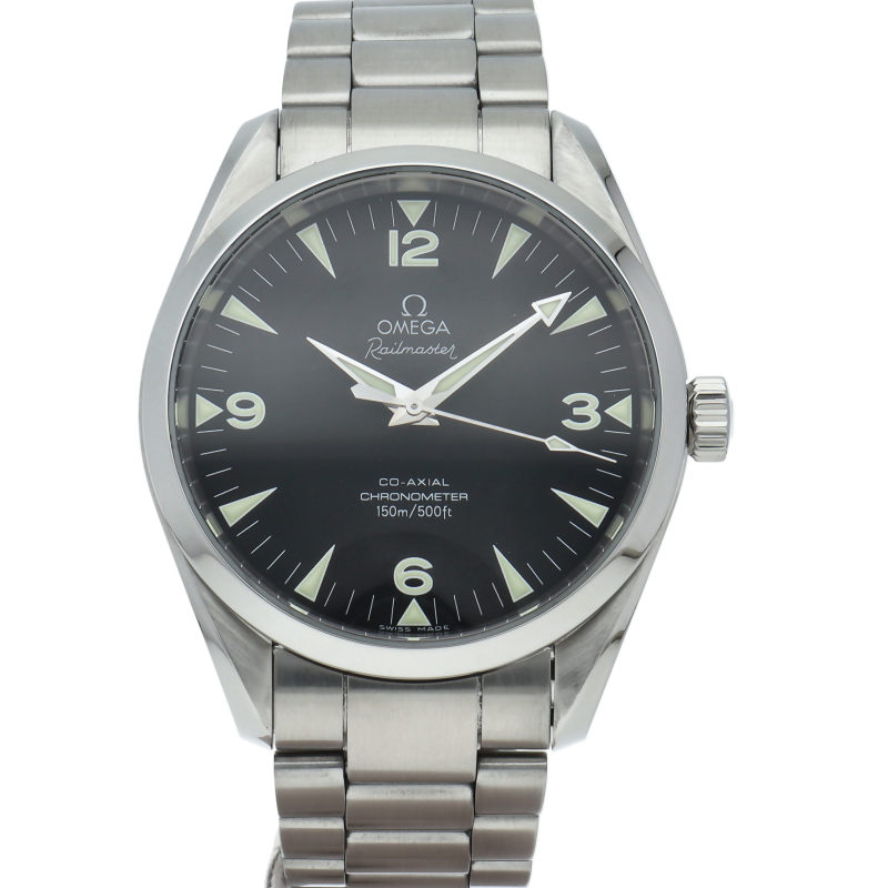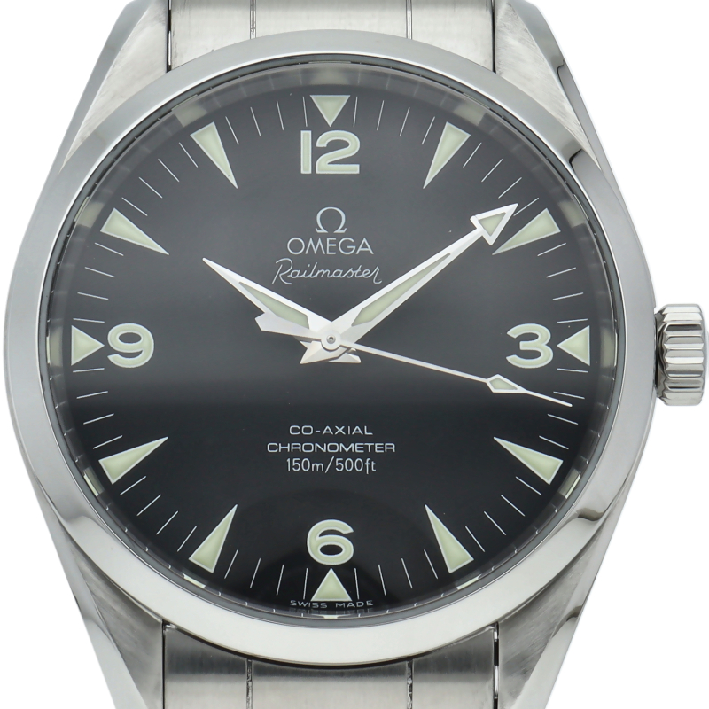 シーマスターアクアテラの派生モデルとして復活を果たしたレイルマスター。ネーミング通り鉄道時計モデルらしく視認性を最大限に強調したダイヤルが特徴的といえます。150m防水、ねじ込み式リューズなど基本スペックはアクアテラと同様です。