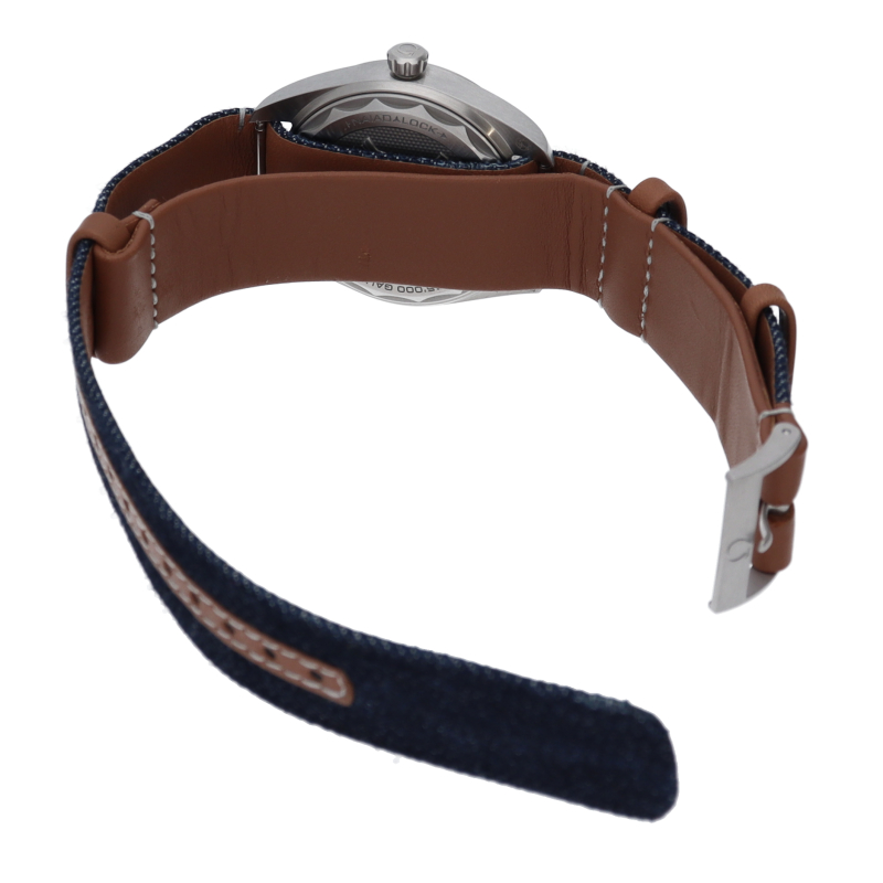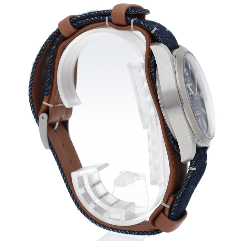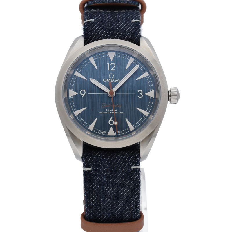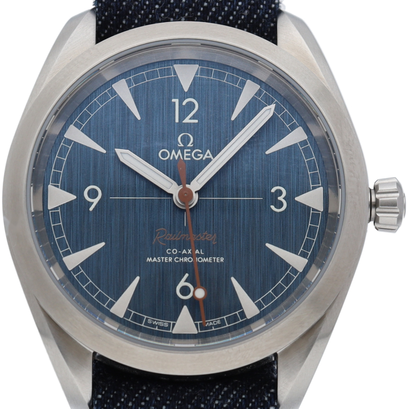 1957年に誕生した「オメガ レイルマスター」は、鉄道や磁場の近くで働く人のためにデザインされた実用的でありながらも、エレガントな時計として知られていました。“ブルージーンズ”のダイアルは縦方向にブラッシュ加工が施され、ライトグレーのスーパールミノヴァが塗布された、ブラッシュ加工のステンレススティール製の針およびアワーマーカーが配されています。