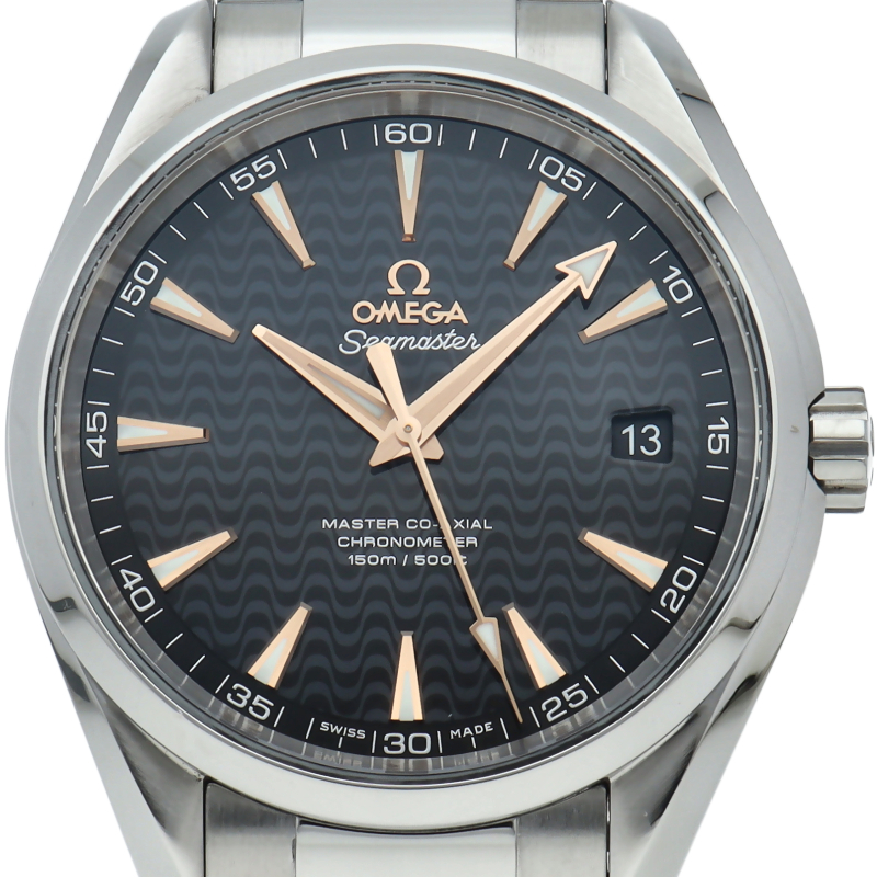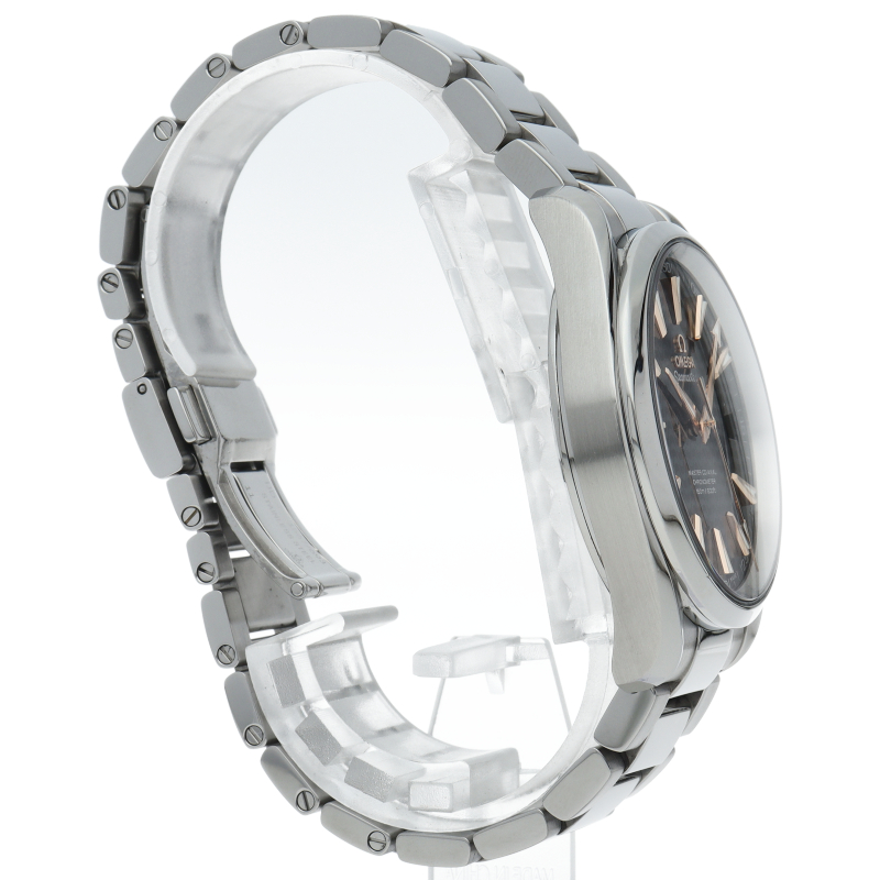 上品でどんなシーンでも使えるシンプルなデザインが特徴の「アクアテラ」。ブラックのダイアルには、中央にサンブラッシュ仕上げが施されており、波模様が転写されています。15,000ガウス以上の耐磁性能を備えたオメガ マスター コーアクシャル キャリバー8500搭載は、ケースバックから眺めることができます。