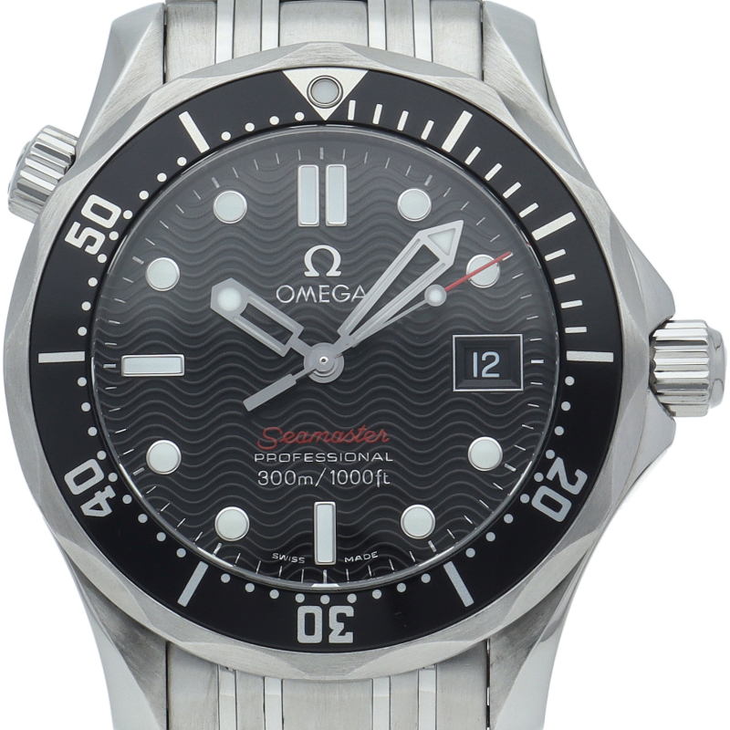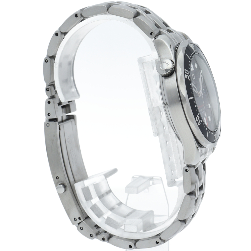 オメガを代表する人気ダイバーズウォッチ「シーマスター」。ヘリウムエスケープバルブを備えた本格的な多機能ダイバーズモデル。黒い文字盤がシャープな印象でスポーティ。ビジネスシーンから本格的なダイビングまでカバーできるオススメの一本です。