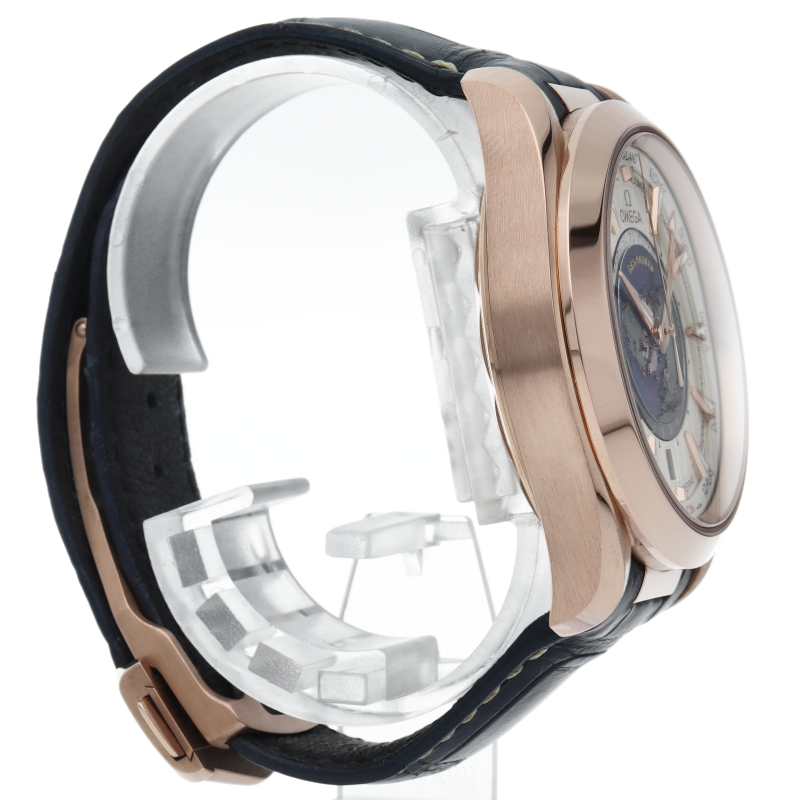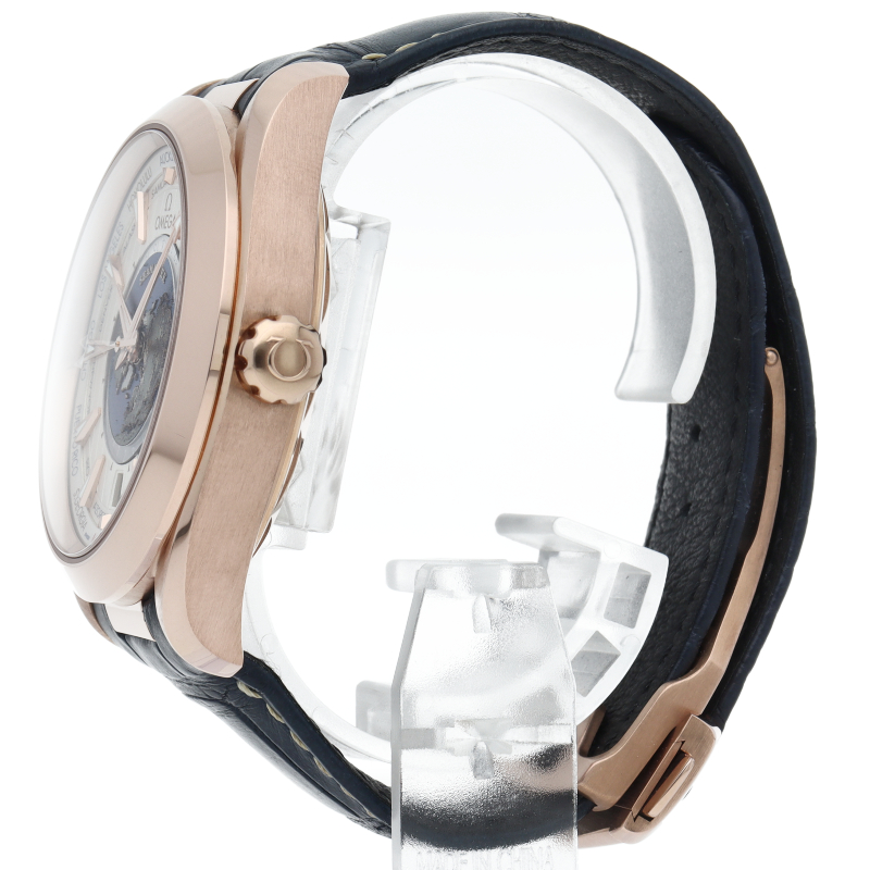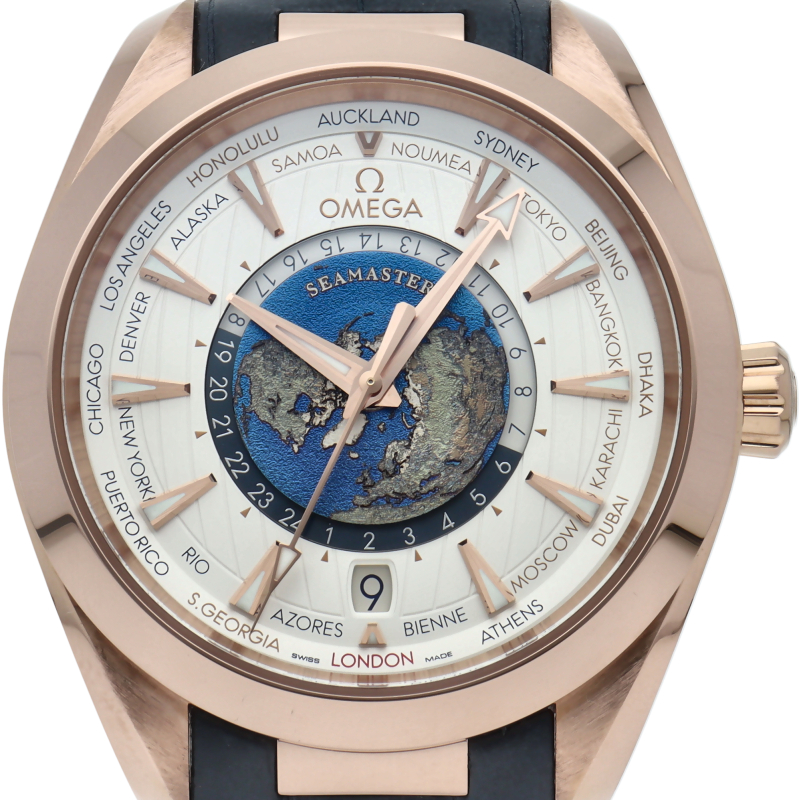 この43mmのワールドタイマーモデルは、ケースとブレスレットにポリッシュ仕上げでピンクゴールドを採用。ポリッシュ仕上げのゴールド製リンクによりブルーのレザーストラップが取り付けられています。その中心には地球をイメージした世界地図がレーザー加工にて立体的に描かれており、世界23都市の時間を瞬時に読み取ることが出来るワールドタイム表示機能を備えたモデルです。