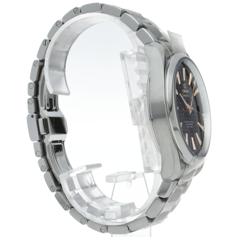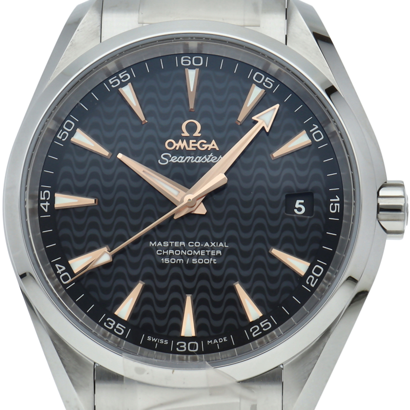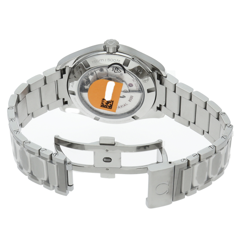 上品でどんなシーンでも使えるシンプルなデザインが特徴の「アクアテラ」。ブラックのダイアルには、中央にサンブラッシュ仕上げが施されており、波模様が転写されています。15,000ガウス以上の耐磁性能を備えたオメガ マスター コーアクシャル キャリバー8500搭載は、ケースバックから眺めることができます。