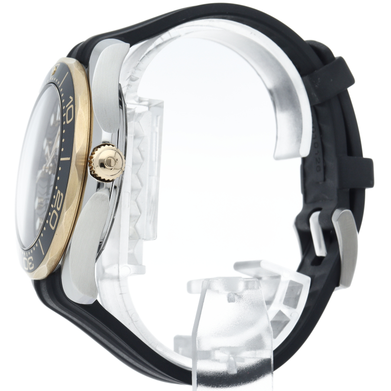 この42mmモデルは、ステンレススティールおよび18Kイエローゴールド製で、ブラックセラミック製ベゼルにはセラゴールド& 技術によるダイビングスケールが付属しています。ダイアルもポリッシュ仕上げのブラックセラミック製で、レーザーエングレービングによる波模様と6時位置の日付表示が特徴です。