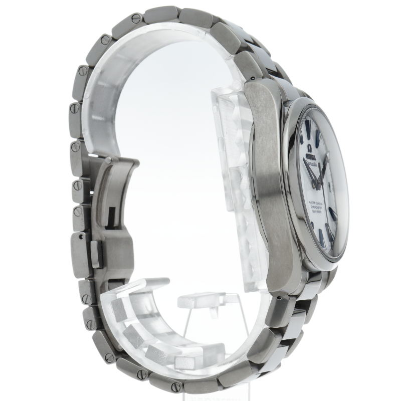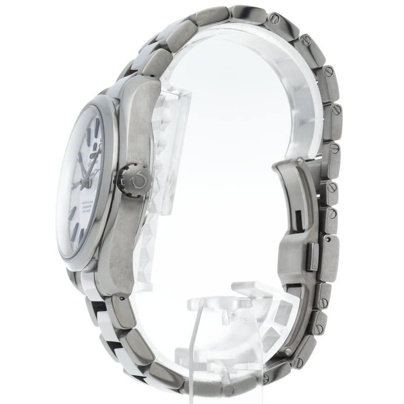 グッドプラネット財団とのパートナーシップを記念して誕生した「シーマスター アクアテラ」のオールチタンモデル。ラッカー仕上げホワイトのダイアルにブルーのアプライドインデックスが美しいデザインの1本。オメガ マスター コーアクシャル キャリバー8500搭載。