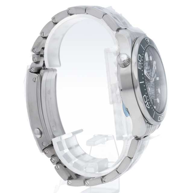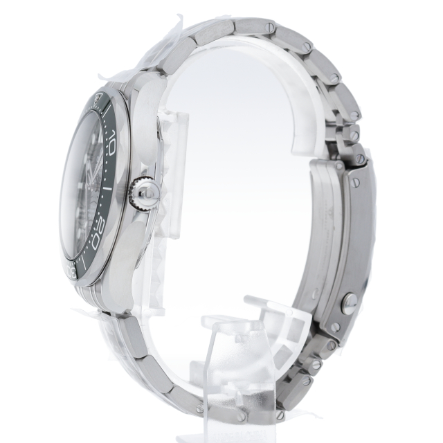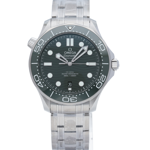 「シーマスター ダイバー300M」は、1993年の発売以来、伝説的な支持を誇っています。このモデルは、ホワイトエナメルでダイビングスケールを描いたグリーンセラミック製ベゼルが付いています。ダイアルもポリッシュ仕上げのグリーンセラミック製で、レーザーエングレービングによる波模様と6時位置の日付表示が特徴です。キャリバー 8800搭載。