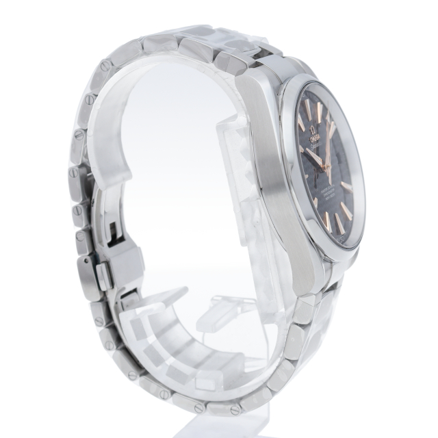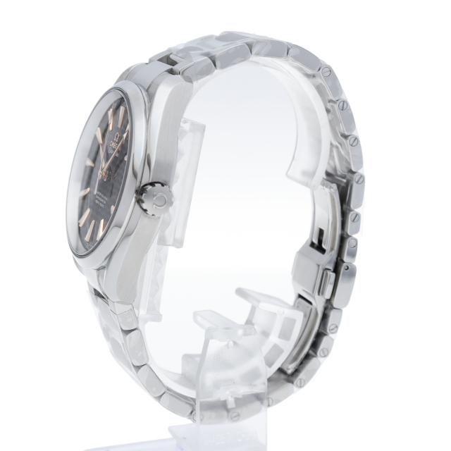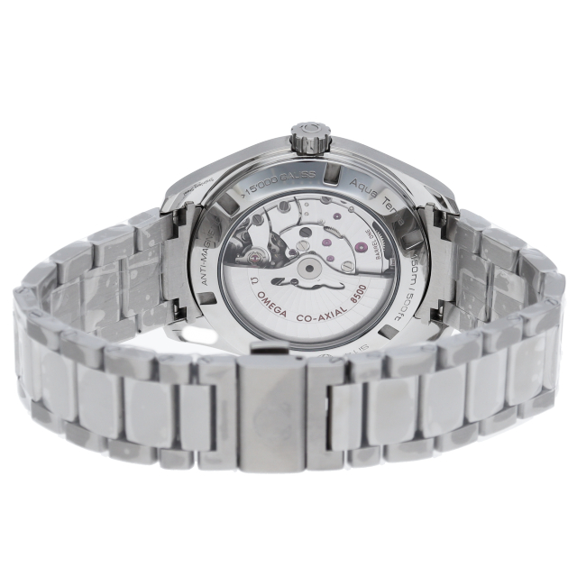 上品でどんなシーンでも使えるシンプルなデザインが特徴の「アクアテラ」。ブラックのダイアルには、中央にサンブラッシュ仕上げが施されており、波模様が転写されています。15,000ガウス以上の耐磁性能を備えたオメガ マスター コーアクシャル キャリバー8500搭載は、ケースバックから眺めることができます。