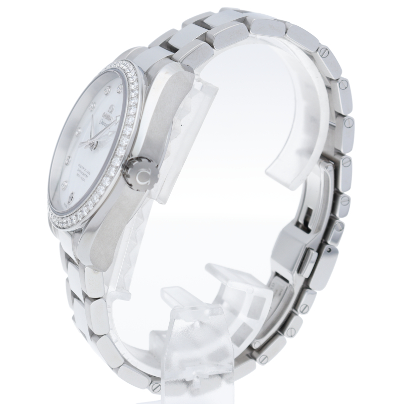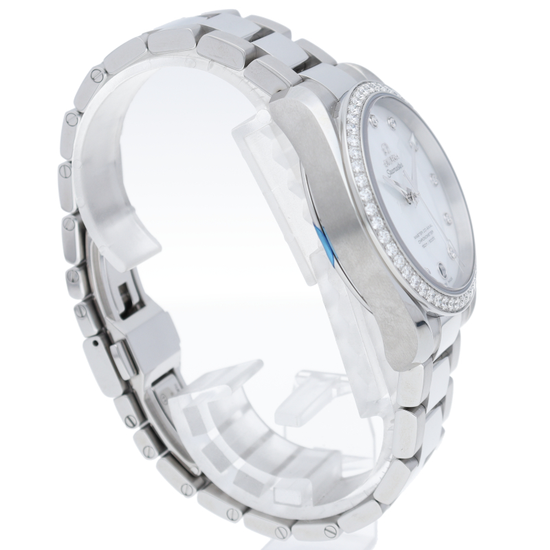 海に携わってきたオメガの長い歴史を代表する「シーマスター アクアテラ」コレクション。インデックスとベゼルにダイヤモンドをセッティングした華やかなシーマスターです。ケースバックはスケルトンとなっております。