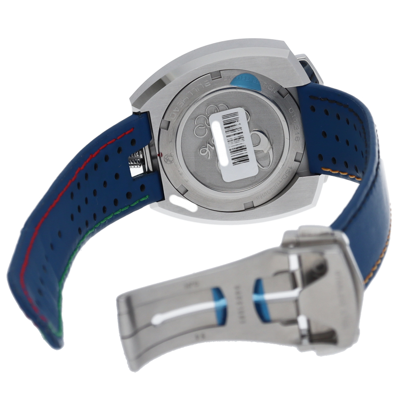 オリンピック大会の精神にインスパイアされたオメガのオリンピック五輪の色を使用したスポーティなタイムピース「シーマスター ブルヘッド リオ リミテッドエディション」。わずか316本のみの世界限定生産。ブラック・イエロー・グリーン・レッドのステッチが入ったブルーのレザーストラップ。「フレデリック・ピゲ」社製コーアクシャルムーブメント、キャリバー3113搭載。