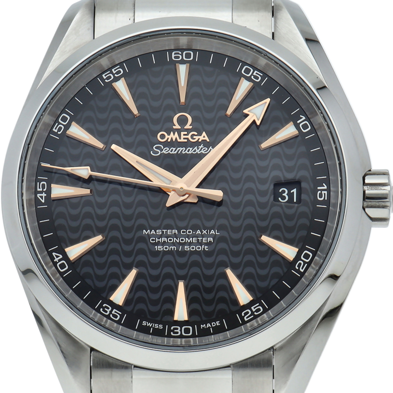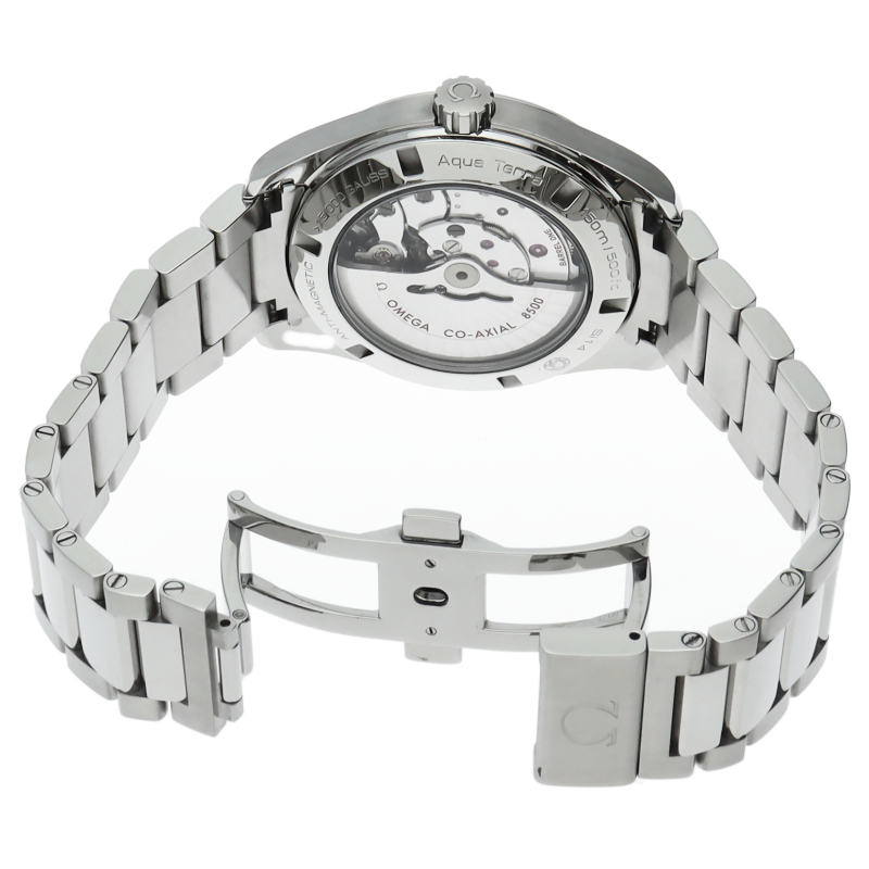 上品でどんなシーンでも使えるシンプルなデザインが特徴の「アクアテラ」。ブラックのダイアルには、中央にサンブラッシュ仕上げが施されており、波模様が転写されています。15,000ガウス以上の耐磁性能を備えたオメガ マスター コーアクシャル キャリバー8500搭載は、ケースバックから眺めることができます。