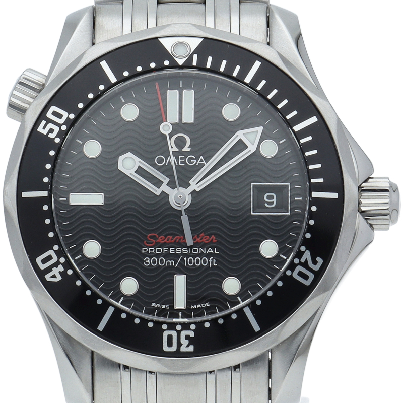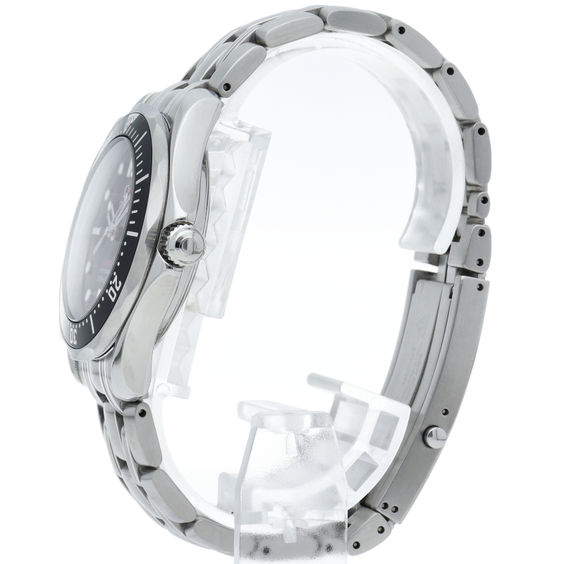 オメガを代表する人気ダイバーズウォッチ「シーマスター」。ヘリウムエスケープバルブを備えた本格的な多機能ダイバーズモデル。黒い文字盤がシャープな印象でスポーティ。ビジネスシーンから本格的なダイビングまでカバーできるオススメの一本です。