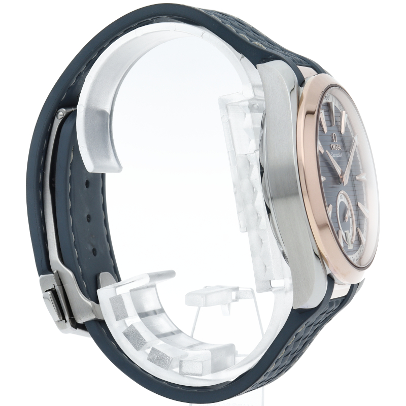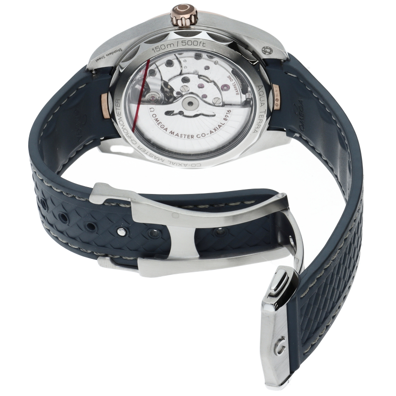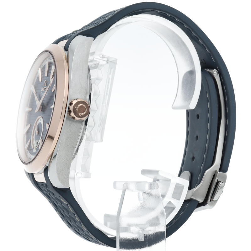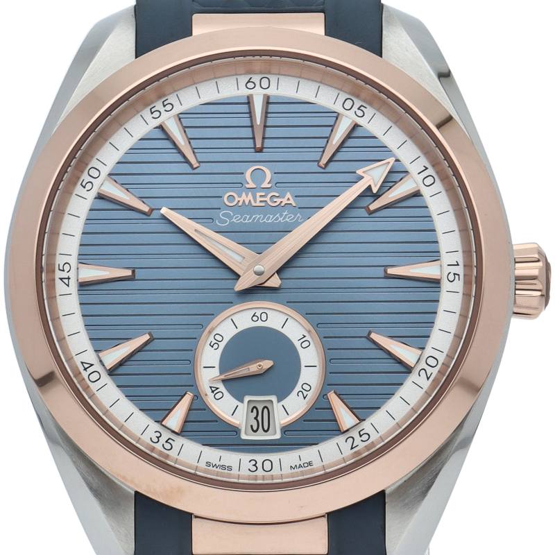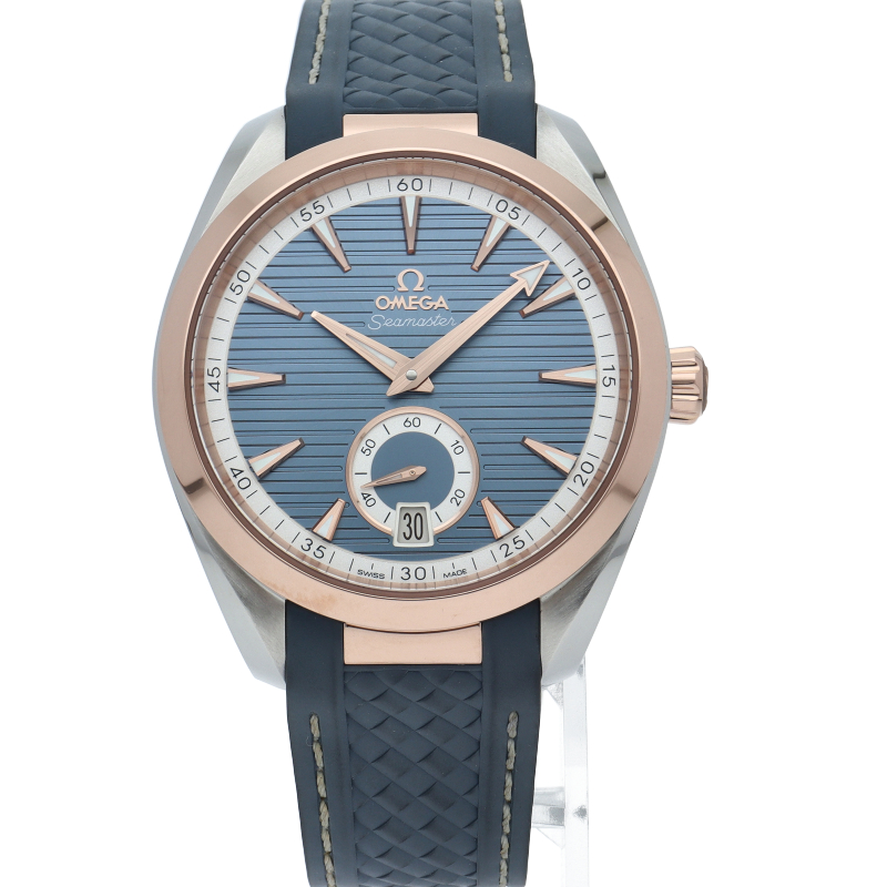 海に携わってきたオメガの長い歴史を代表する「シーマスター アクアテラ」コレクション。サンブラッシュ仕上げのブルーグレーの文字盤には横縞模様の“チーク”パターンが施され、6時位置に日付表示窓と、18Kセドナゴールド製リングが付いたスモールセコンド サブダイアルが配されています。スイス連邦計量・認定局(METAS)認定の最高水準を誇るオメガ コーアクシャル マスター クロノメーター キャリバー8916搭載。