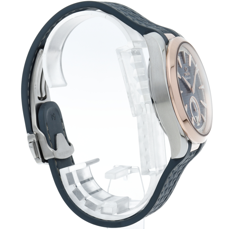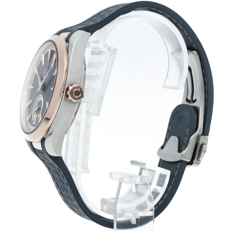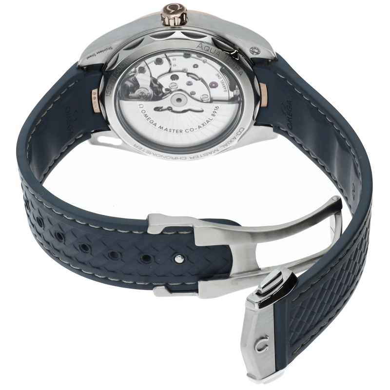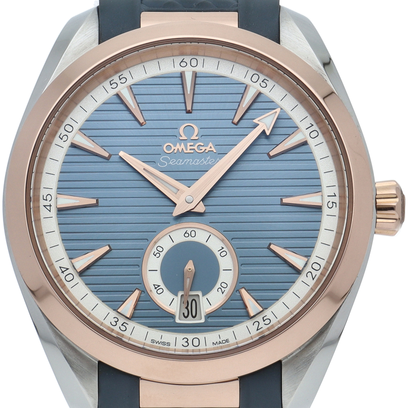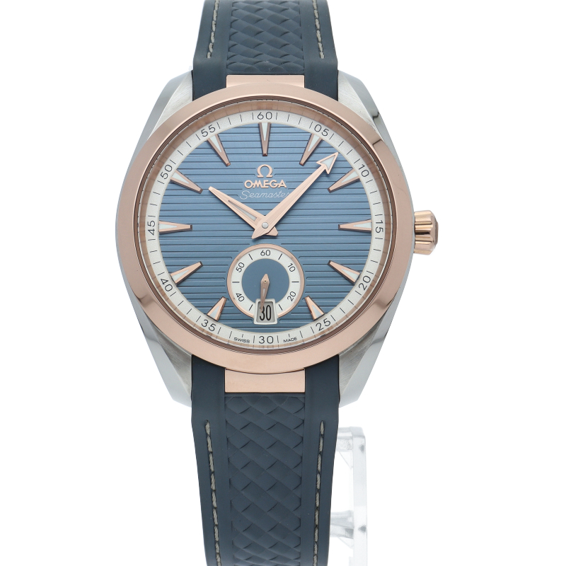 海に携わってきたオメガの長い歴史を代表する「シーマスター アクアテラ」コレクション。サンブラッシュ仕上げのブルーグレーの文字盤には横縞模様の“チーク”パターンが施され、6時位置に日付表示窓と、18Kセドナゴールド製リングが付いたスモールセコンド サブダイアルが配されています。スイス連邦計量・認定局(METAS)認定の最高水準を誇るオメガ コーアクシャル マスター クロノメーター キャリバー8916搭載。