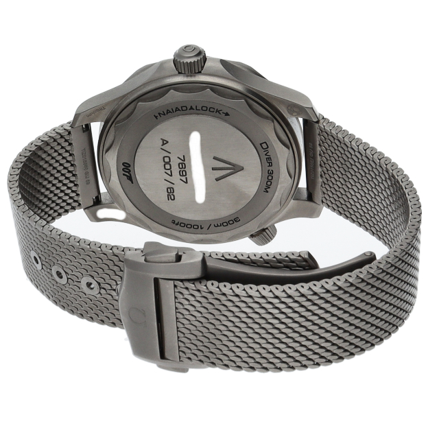 映画007の「ノータイム トゥ ダイ」で実際にジェームズ・ボンドが着用するモデルと同一デザインが心をくすぐる一品。そのデザインにはダニエル・クレイグの意見が反映されており、劇中のジェームズ・ボンドが英国海軍中佐の設定ということもあり、文字盤の6時位置には英国軍官給品である事を示すブロードアローがプリントされており、裏蓋にも同様のエングレービングが施されています。