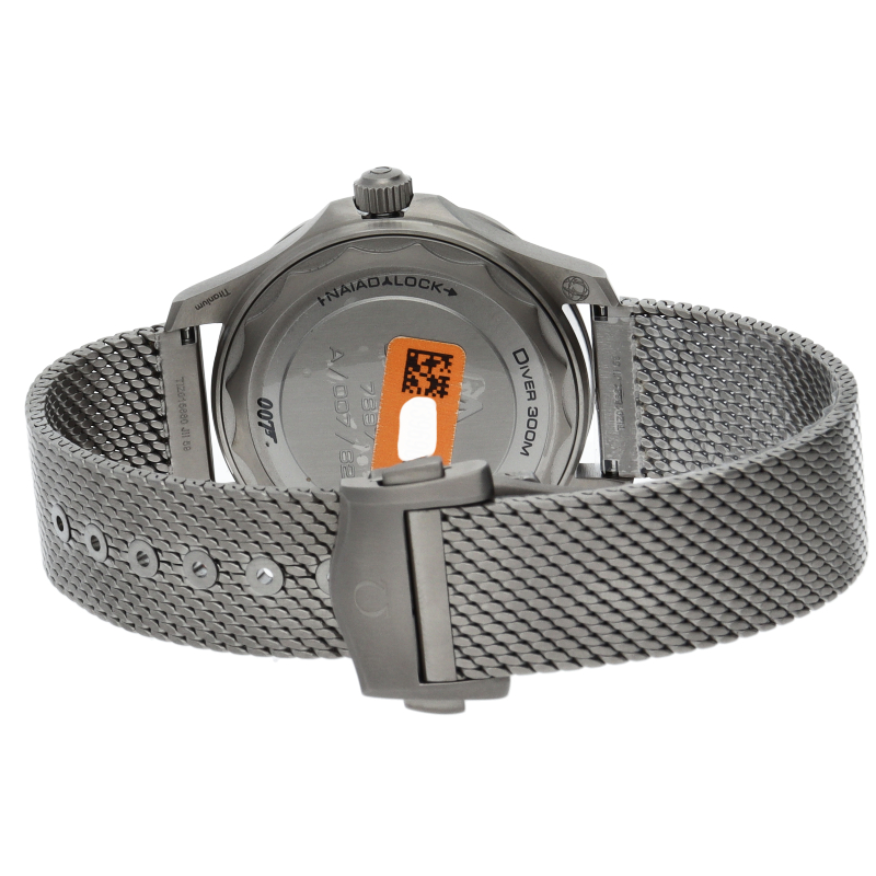 映画007の「ノータイム トゥ ダイ」で実際にジェームズ・ボンドが着用するモデルと同一デザインが心をくすぐる一品。そのデザインにはダニエル・クレイグの意見が反映されており、劇中のジェームズ・ボンドが英国海軍中佐の設定ということもあり、文字盤の6時位置には英国軍官給品である事を示すブロードアローがプリントされており、裏蓋にも同様のエングレービングが施されています。